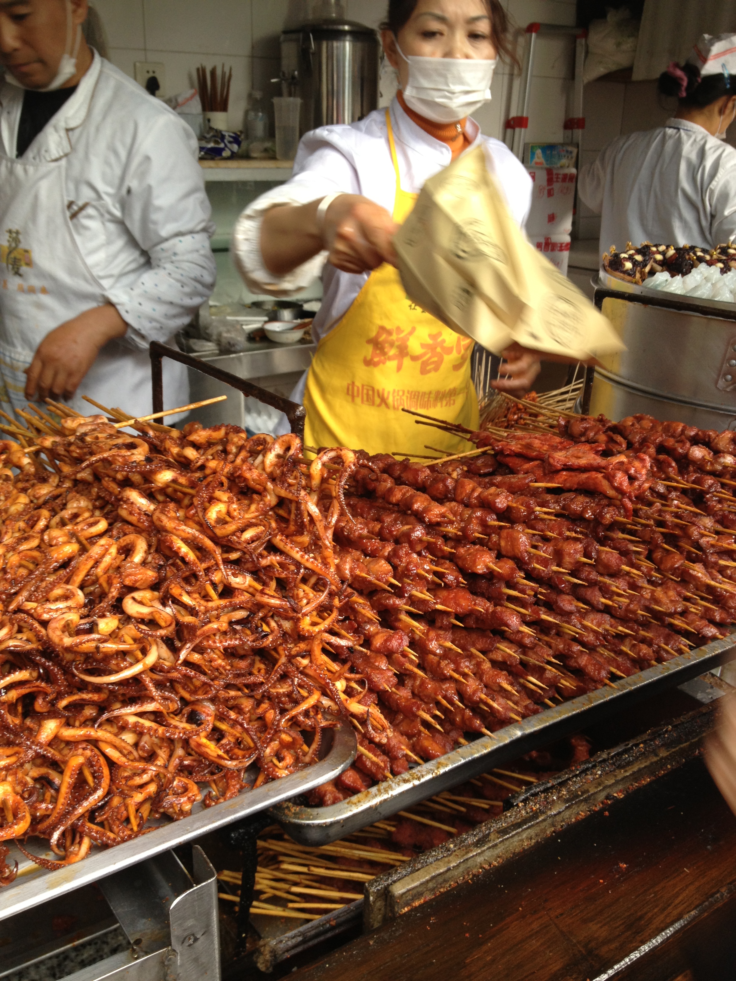 All kinds of kebabs.  We got chicken and squid and scallop.  Spicy, but nice!