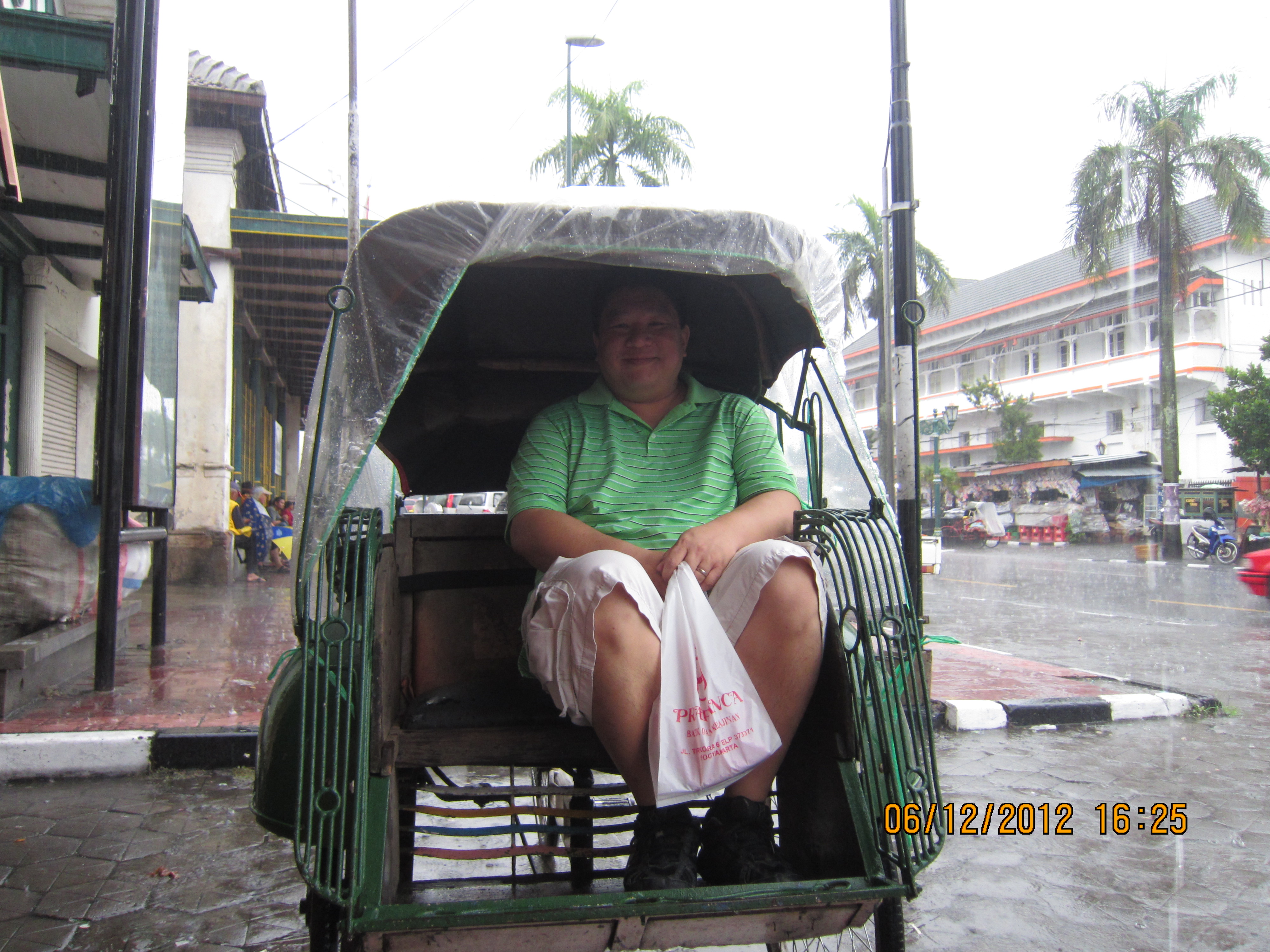 After our Nasi Gudeg, we started our walk up Malioboro Street. We stopped and bought a real cute baby batik dress for Keira for 5,000 Rupiah, which was quite cute. Then we took one of those Ojeks, the bicycle taxis because it was raining so heavily!