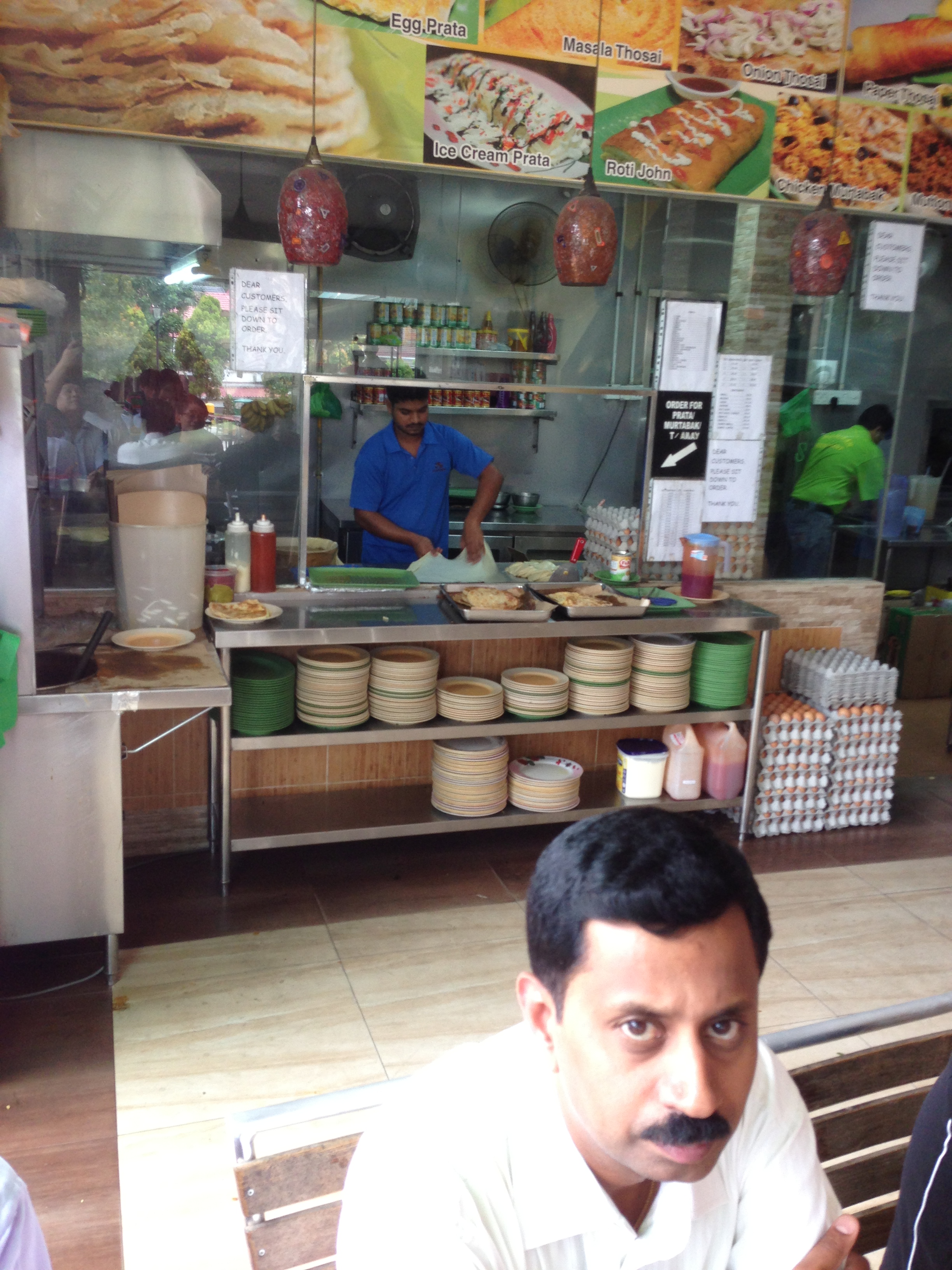 Because there is a mixture of food, there are separate cooking areas. Here is the prata/murtabak cooking area, with the guy making prata.