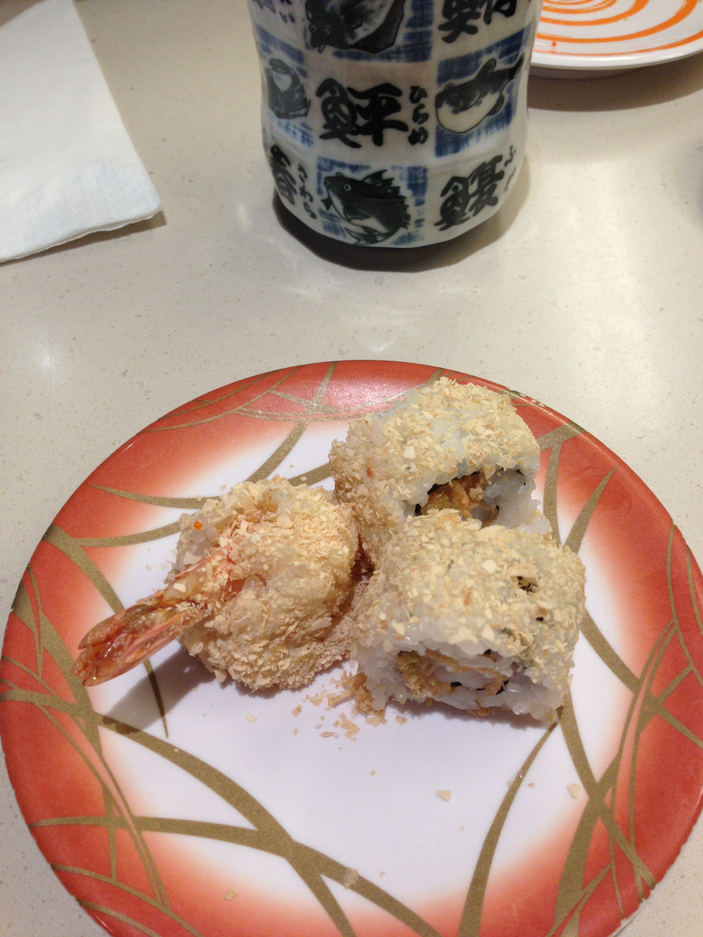 Here is a roll that features some spicy tuna, then shrimp salad. It was very nice, the rice was nice and sticky. The rice roll was also tempura fried before putting the shrimp salad on top.