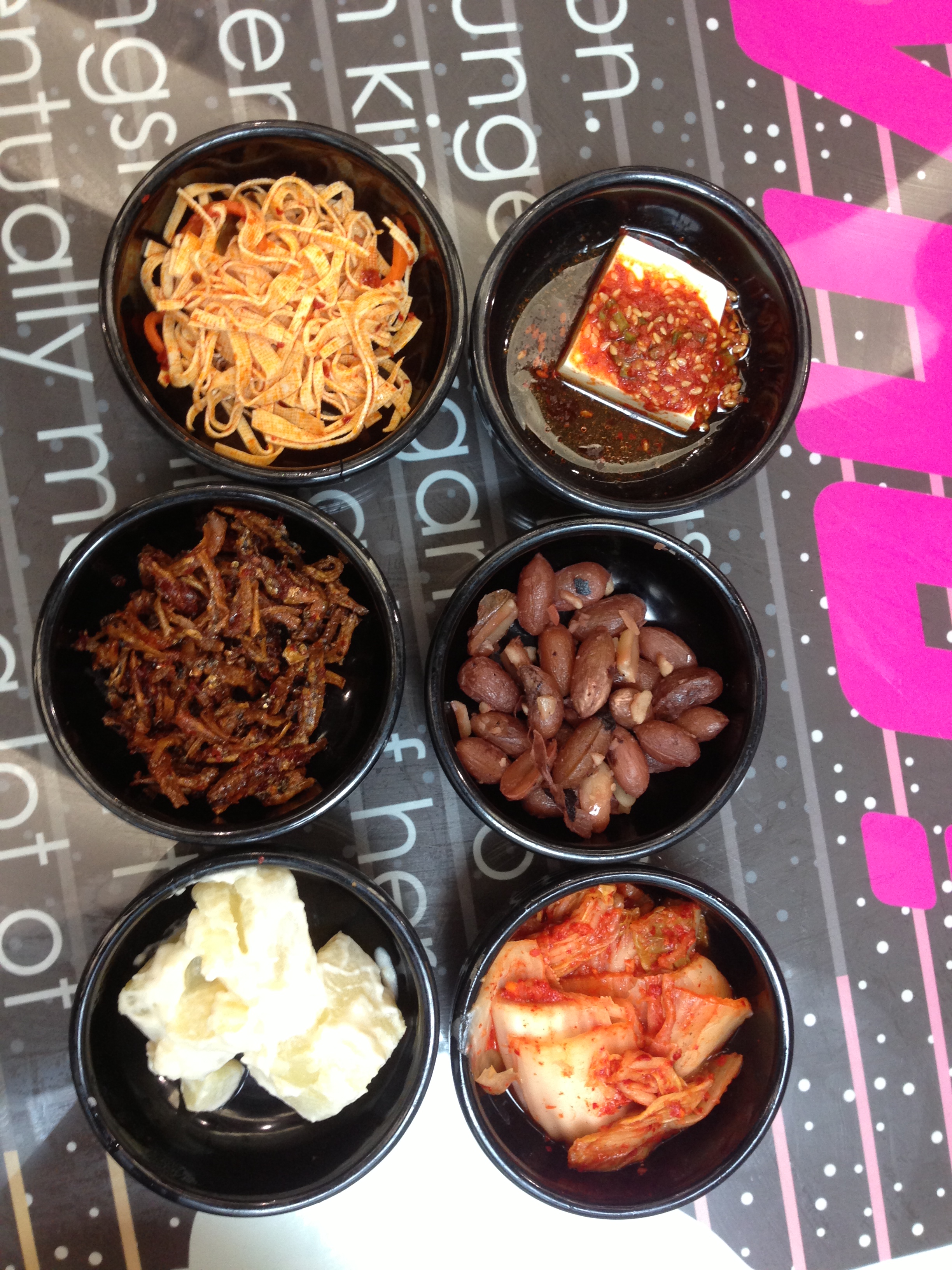 The side dishes, small in number, but good in taste. Top Row, left to right, is Tofu, Peanuts and Kimchi, the bottom row, left to right, is Tofu noodles, fried anchovies and potato salad.