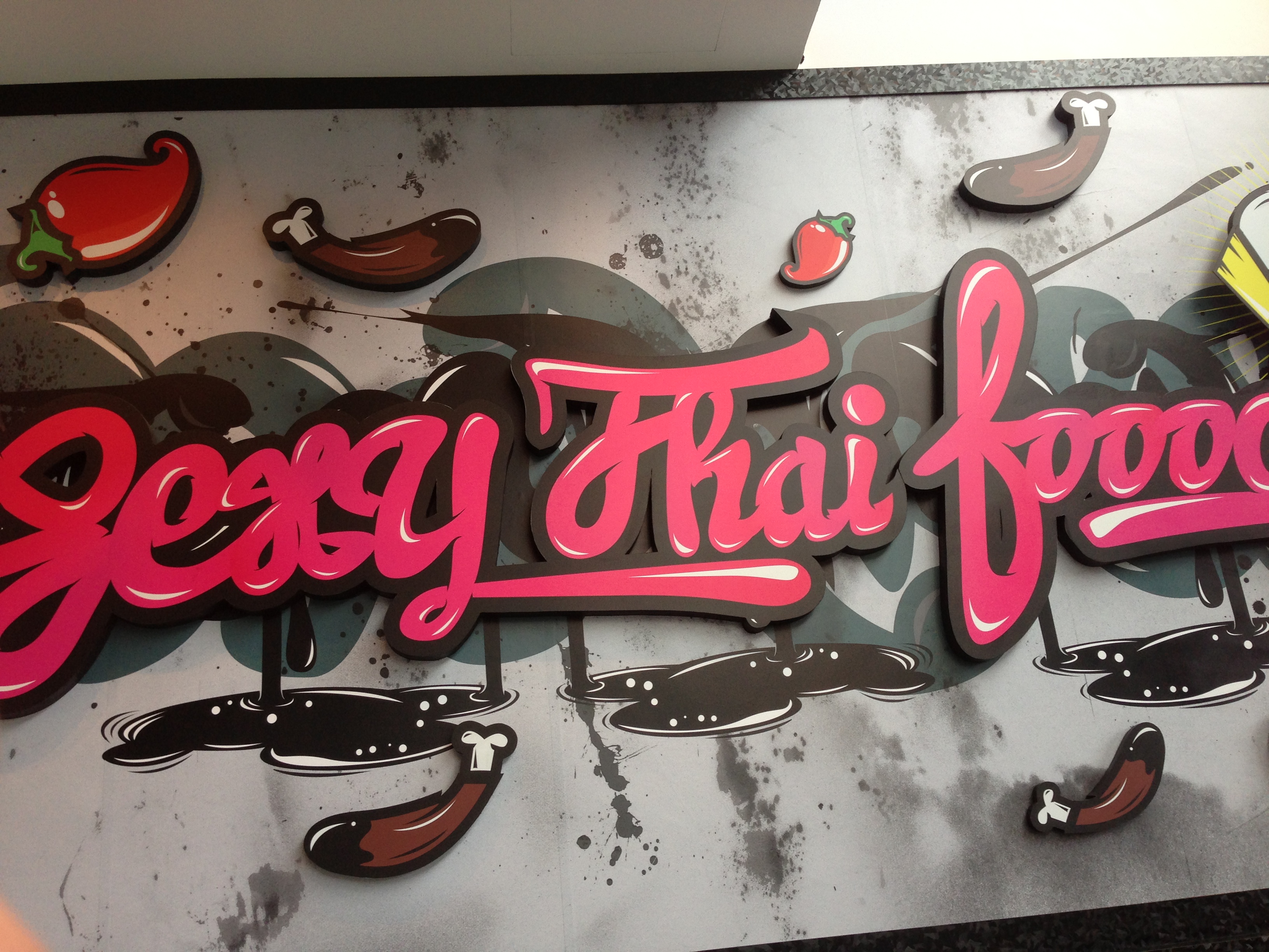 Everything inside has the logo, from the plates to the napkins. And the decoration inside is like Thai youngster graffiti.