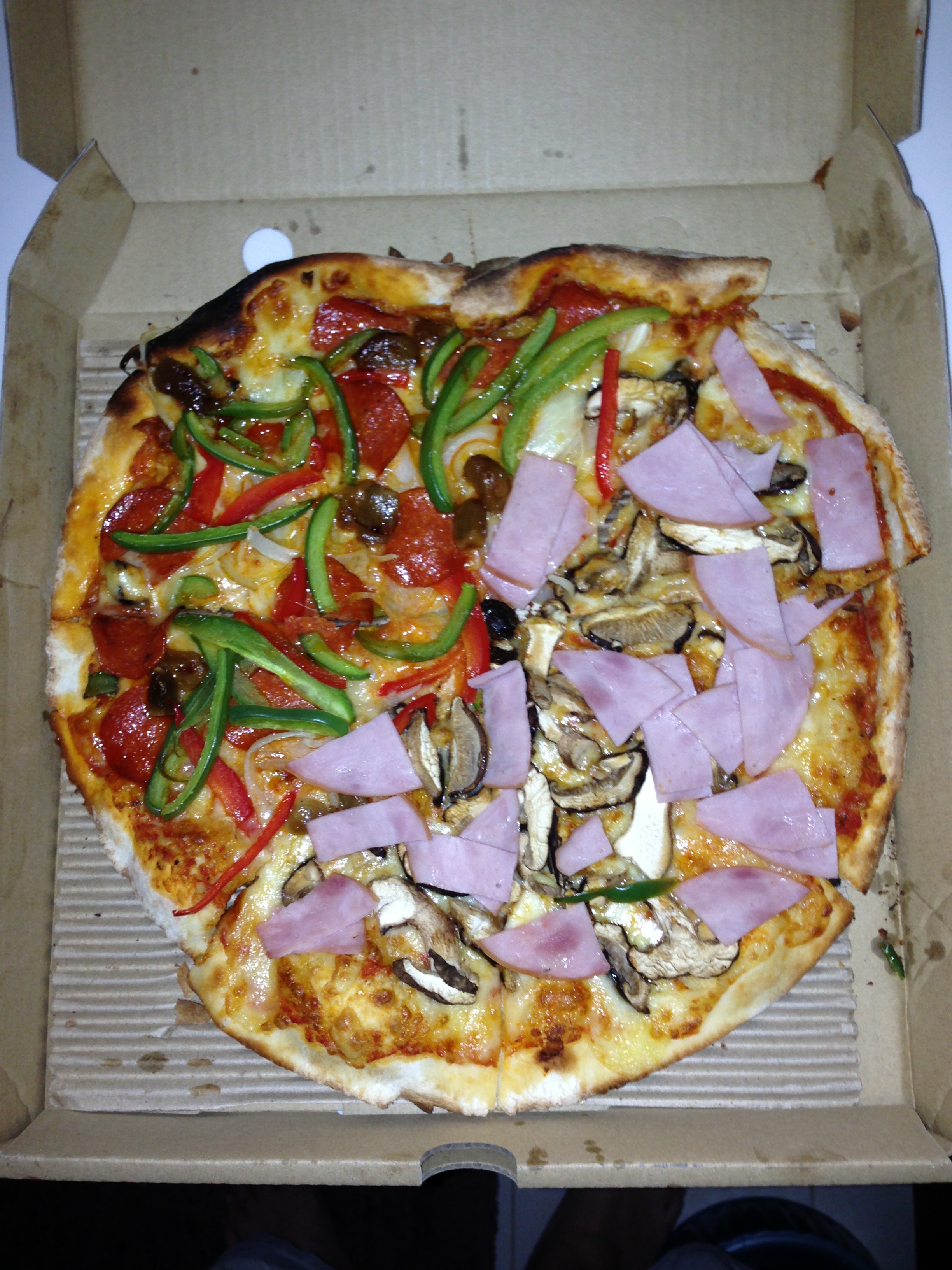 So I went for a half and half, just to try different styles. One side was Pepperoni, Peppers, Onions and Roasted Garlic. The other half was Ham and Mushrooms. It looks good, doesn’t it?