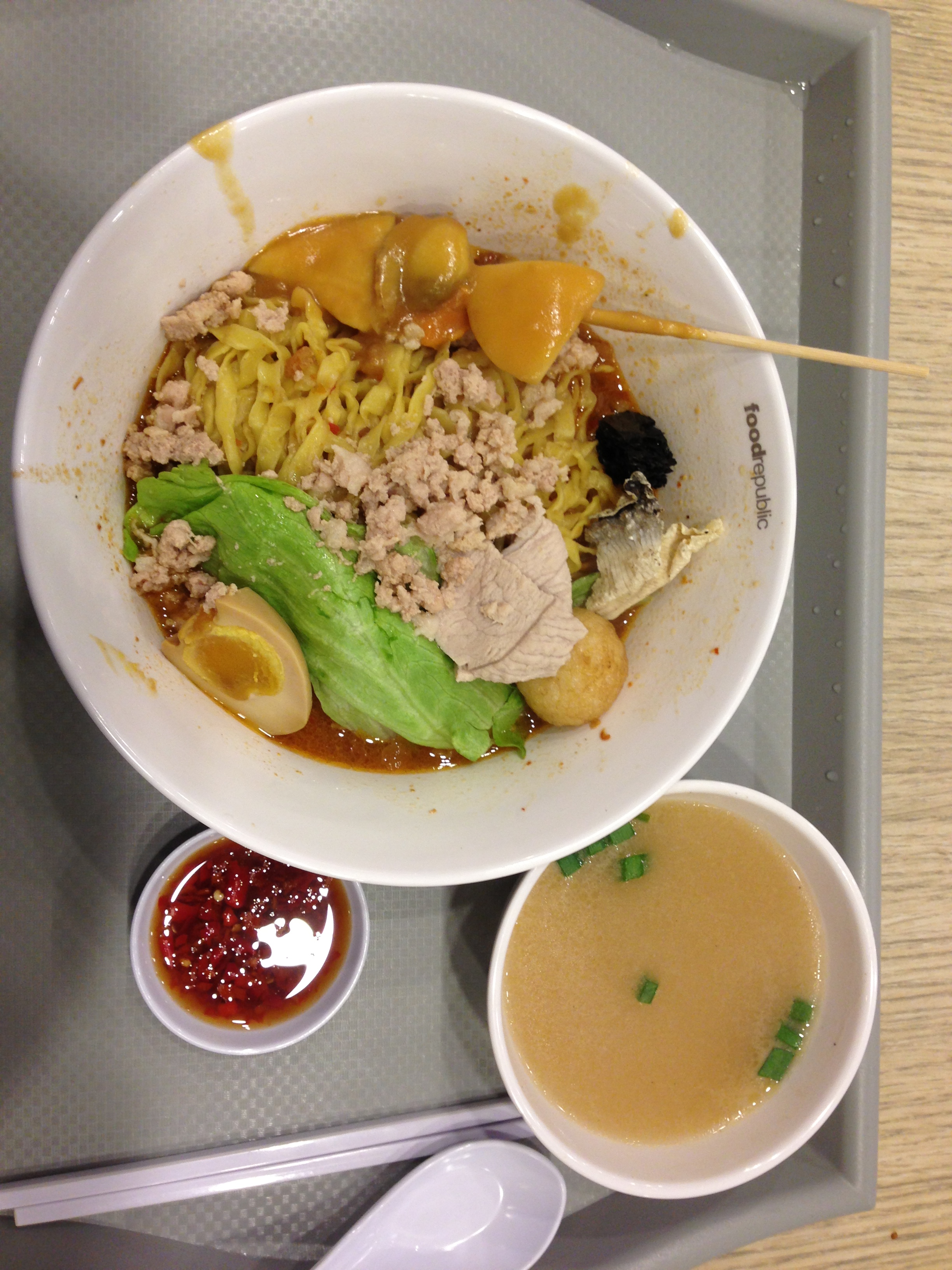 So as you see, it’s Mee Pok, with minced pork meat, a few slices of pork and lettuce. Some fa cai, a piece of fried salmon skin, some fried lard, and an egg which I think was cooked in Soy Sauce, it was soooooooo salty and tasted like soy sauce.