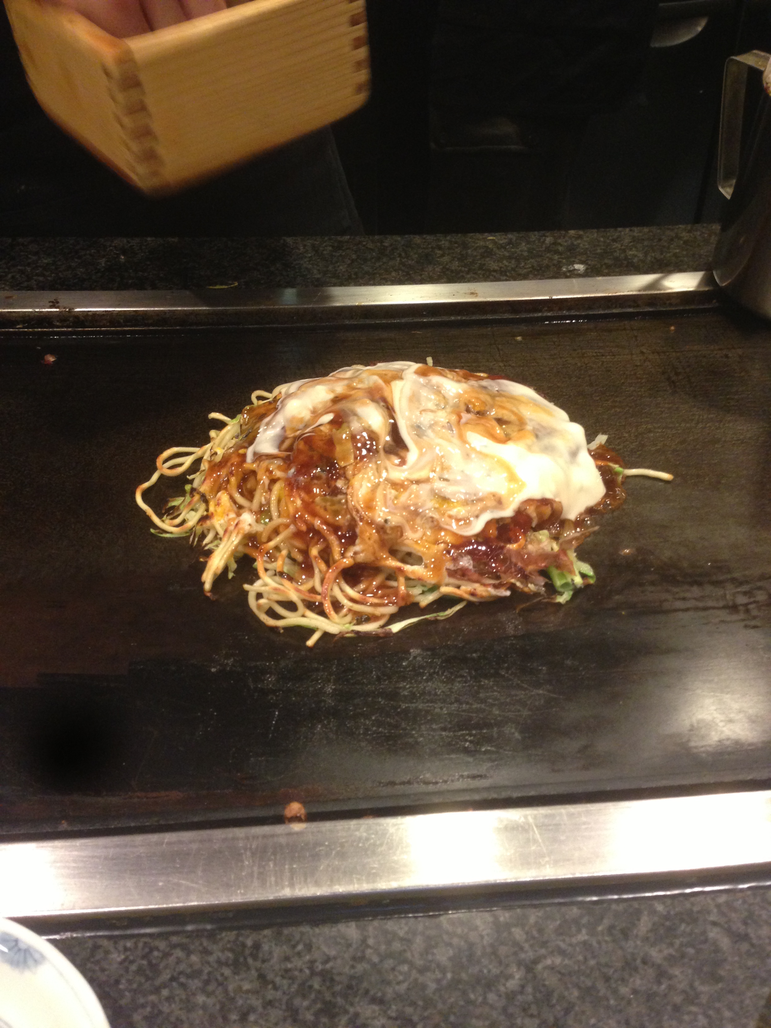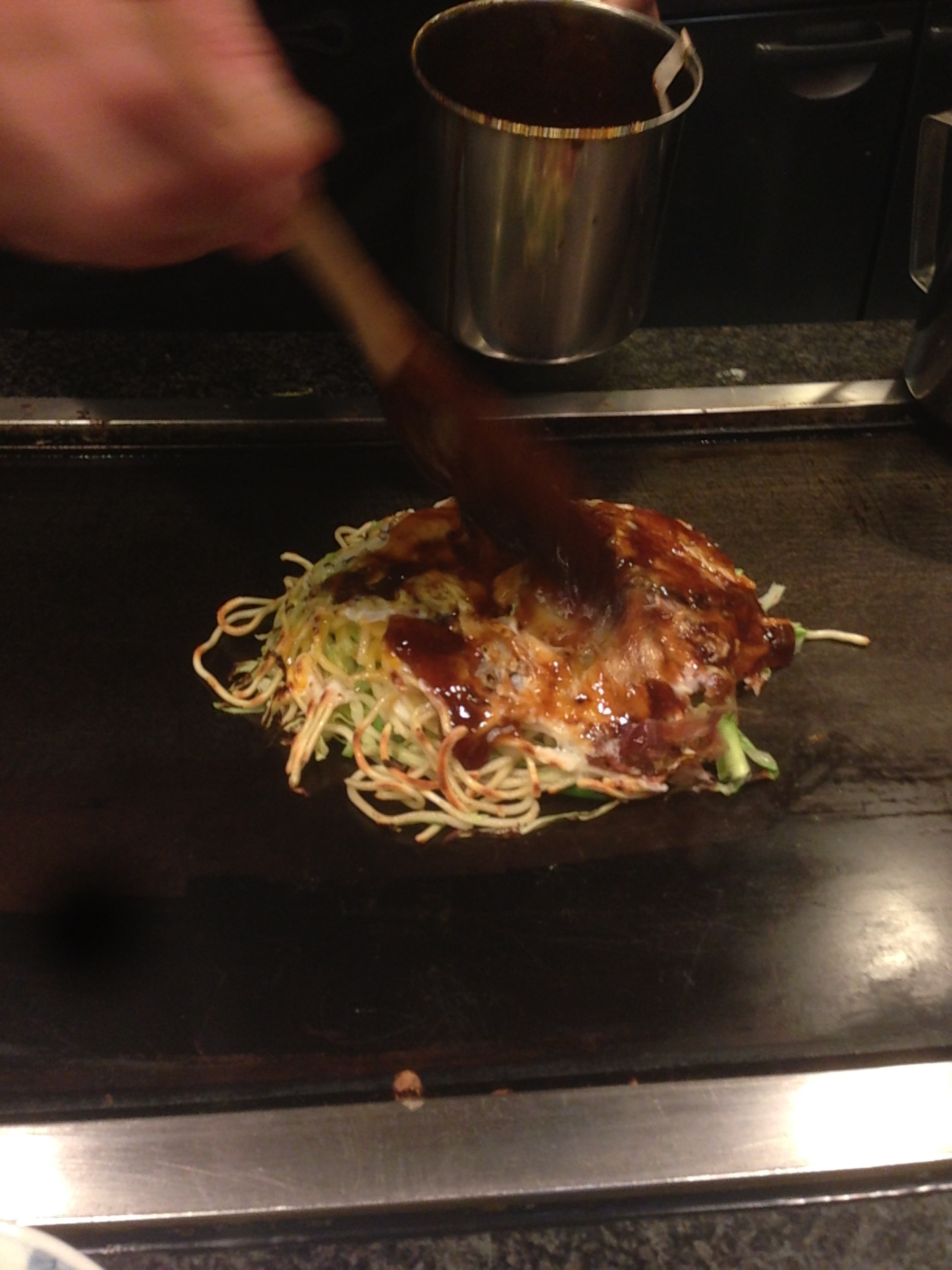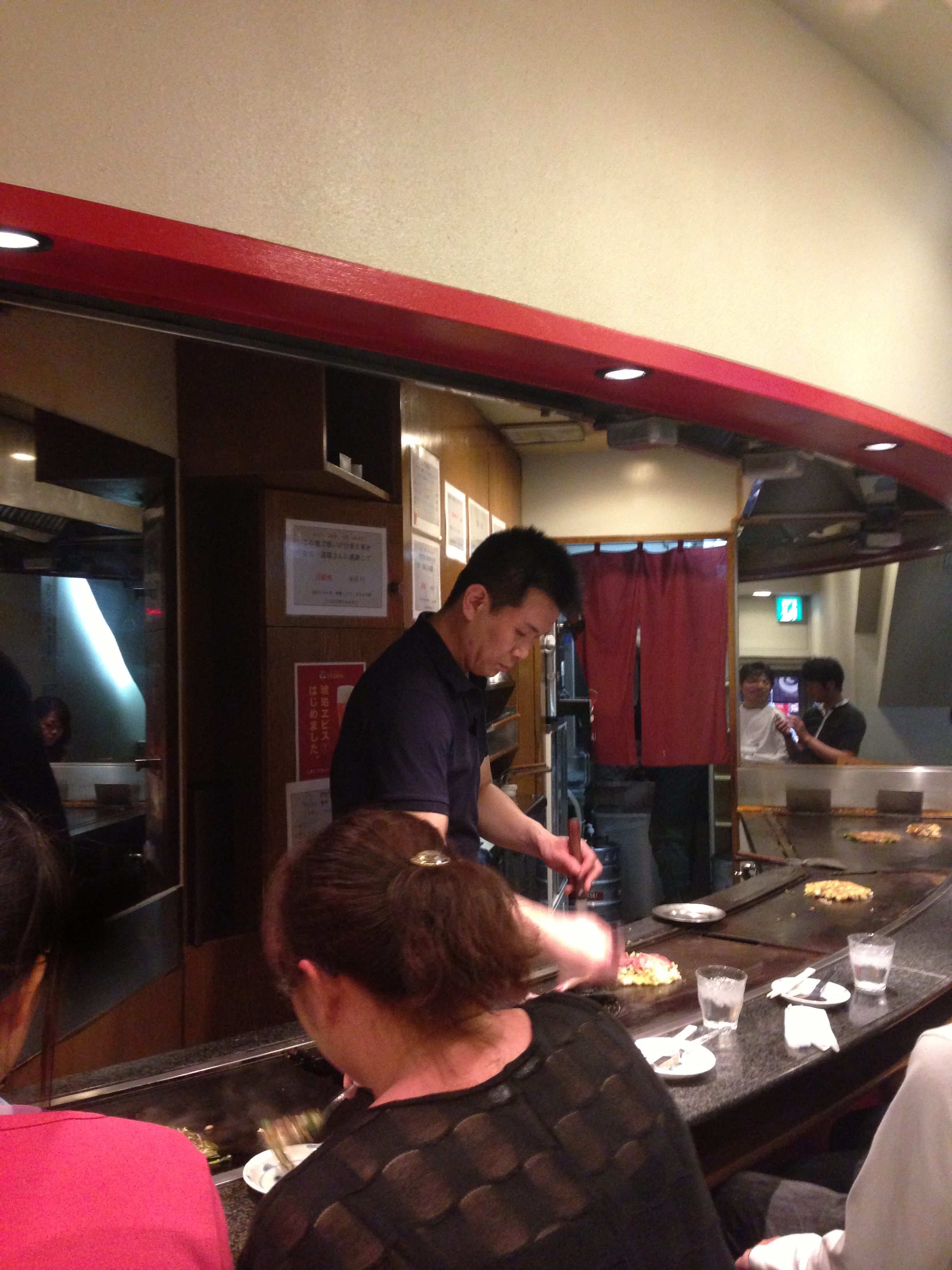 As you walk in, you see the counter and a chef cooking Okonomiyaki. We took our place at the grill.