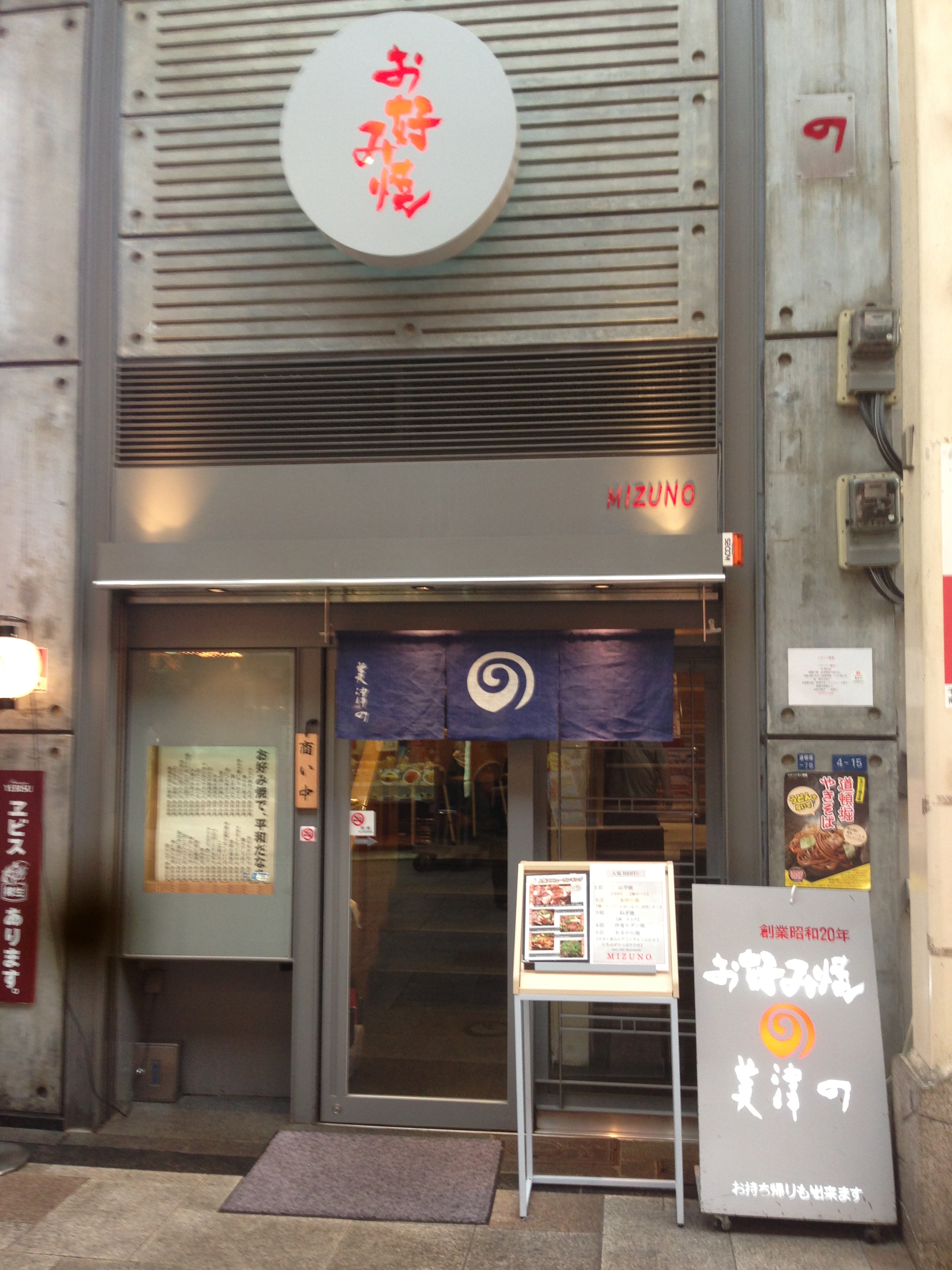 One of the spots where everyone says you should eat Okonomiyaki is Mizuno, near Dotonburi. Sure enough, when you walk down Dotonburi and you take a slight side road, you will find this small place. I believe it’s two levels, but we sat on the first level and it was quite small, seating about nine persons at the Okonomiyaki grill.