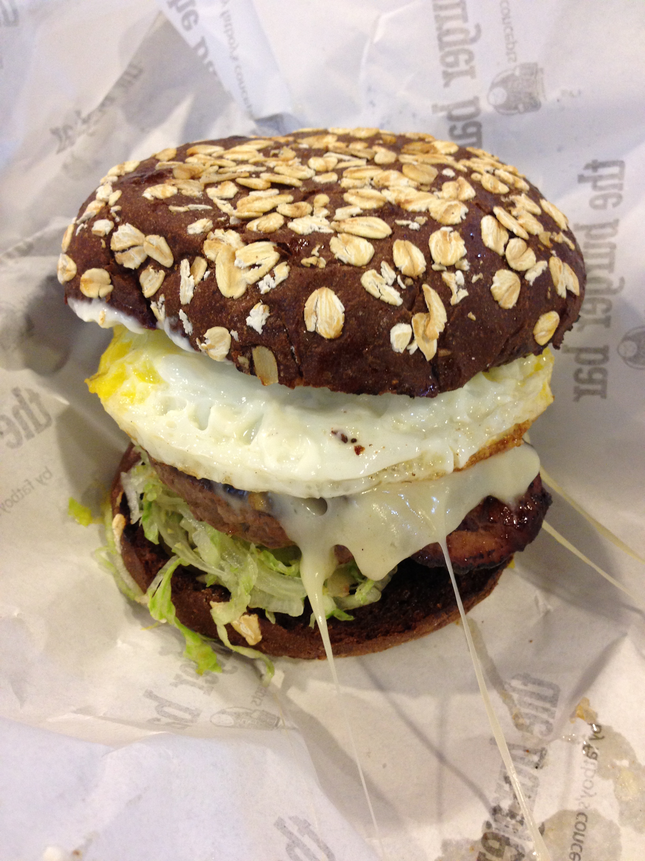 Then the first burger was a beef burger, topped with Jack cheese, bacon and a fried egg on a honey oat bun. Nice tasting, the burger a little meatloafy, but still good enough!