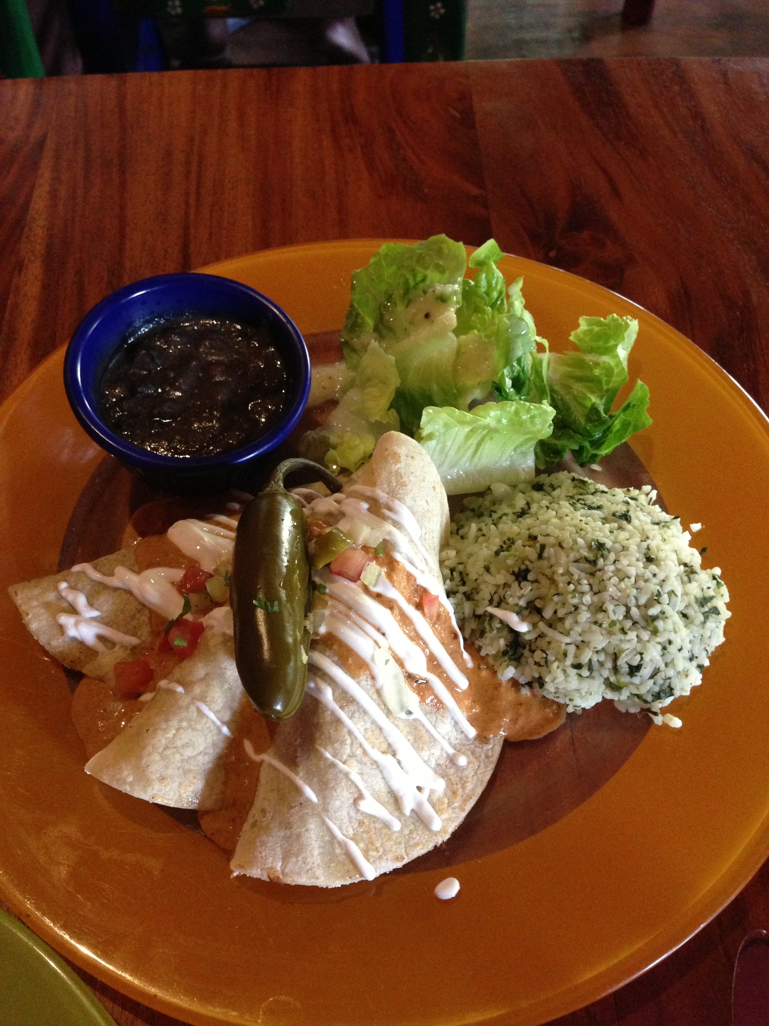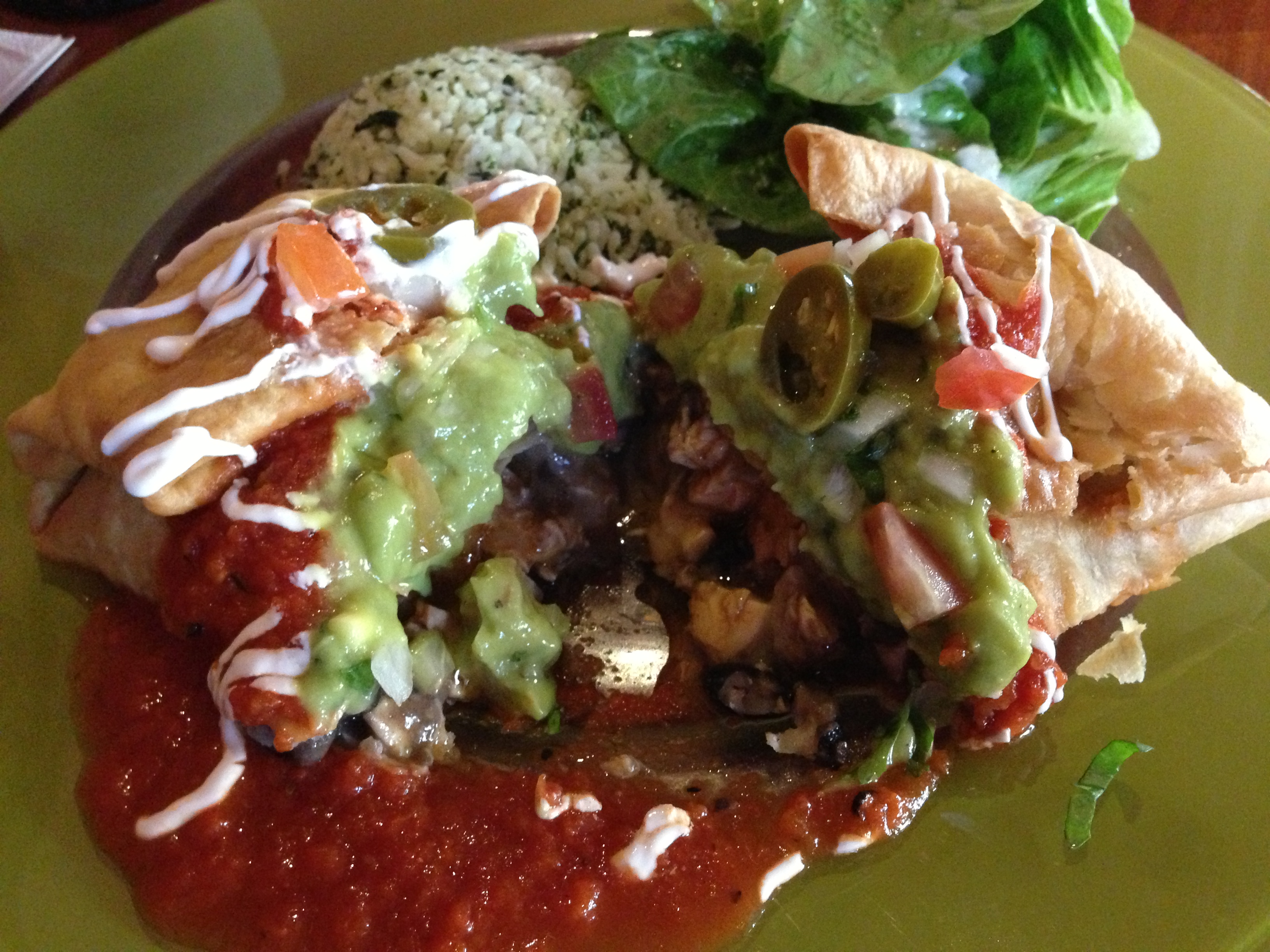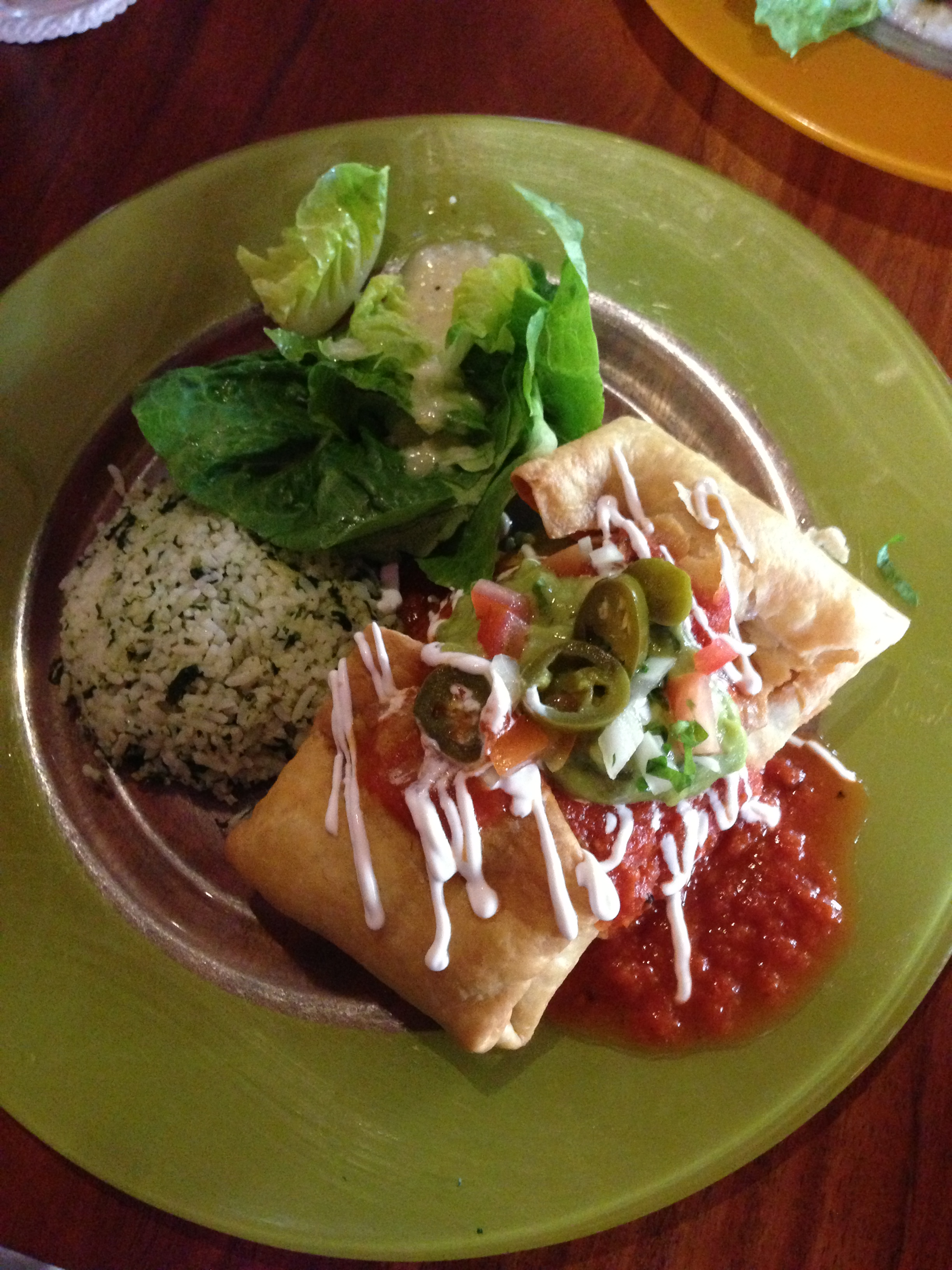 Next, I went with one of my favorites, the Chimichanga. I was expecting a nice crispy torilla on the outside, wrapped around lovely meat and cheese. I went for chicken here. And on top, I expect a nice salsa type sauce.