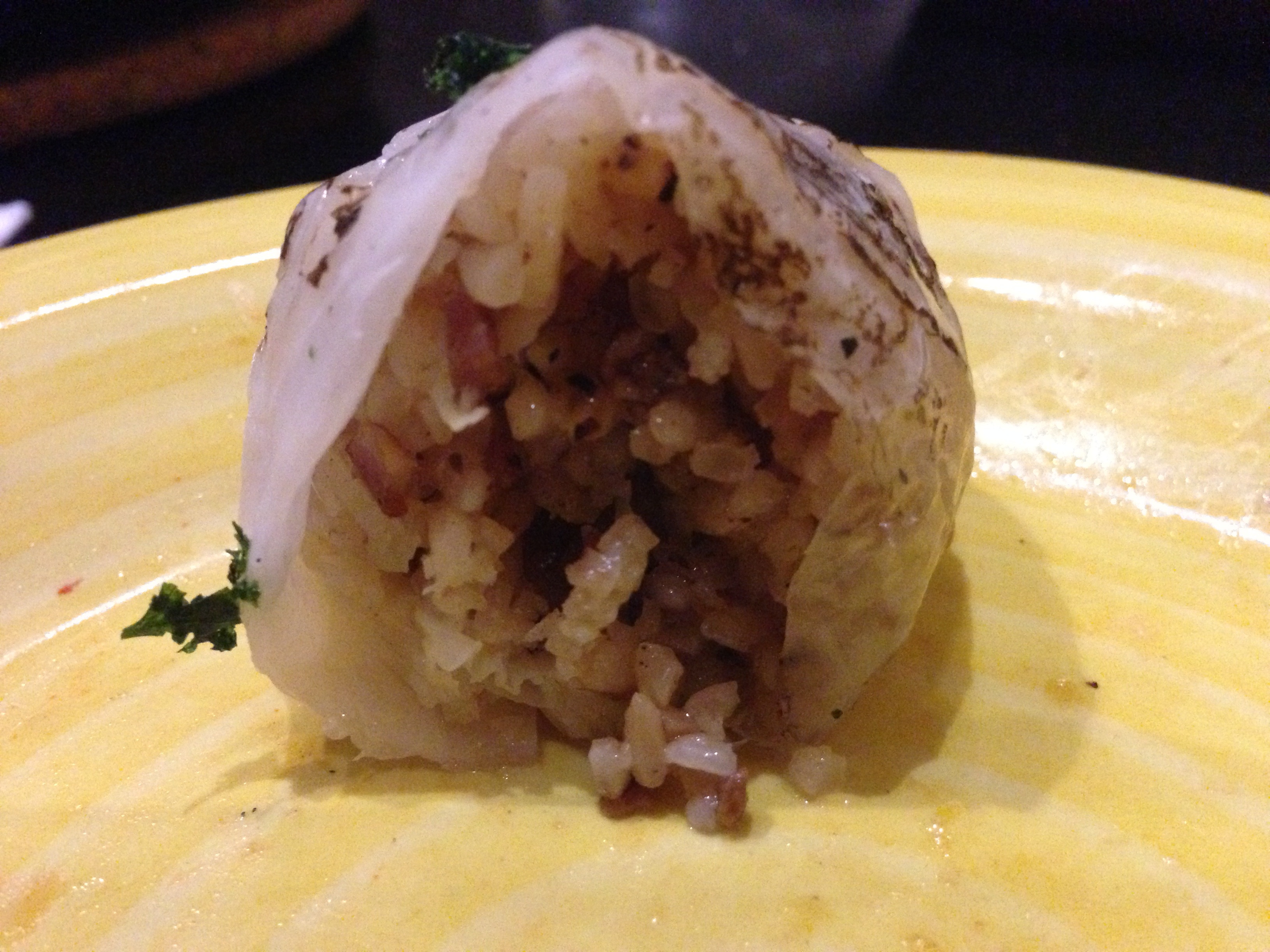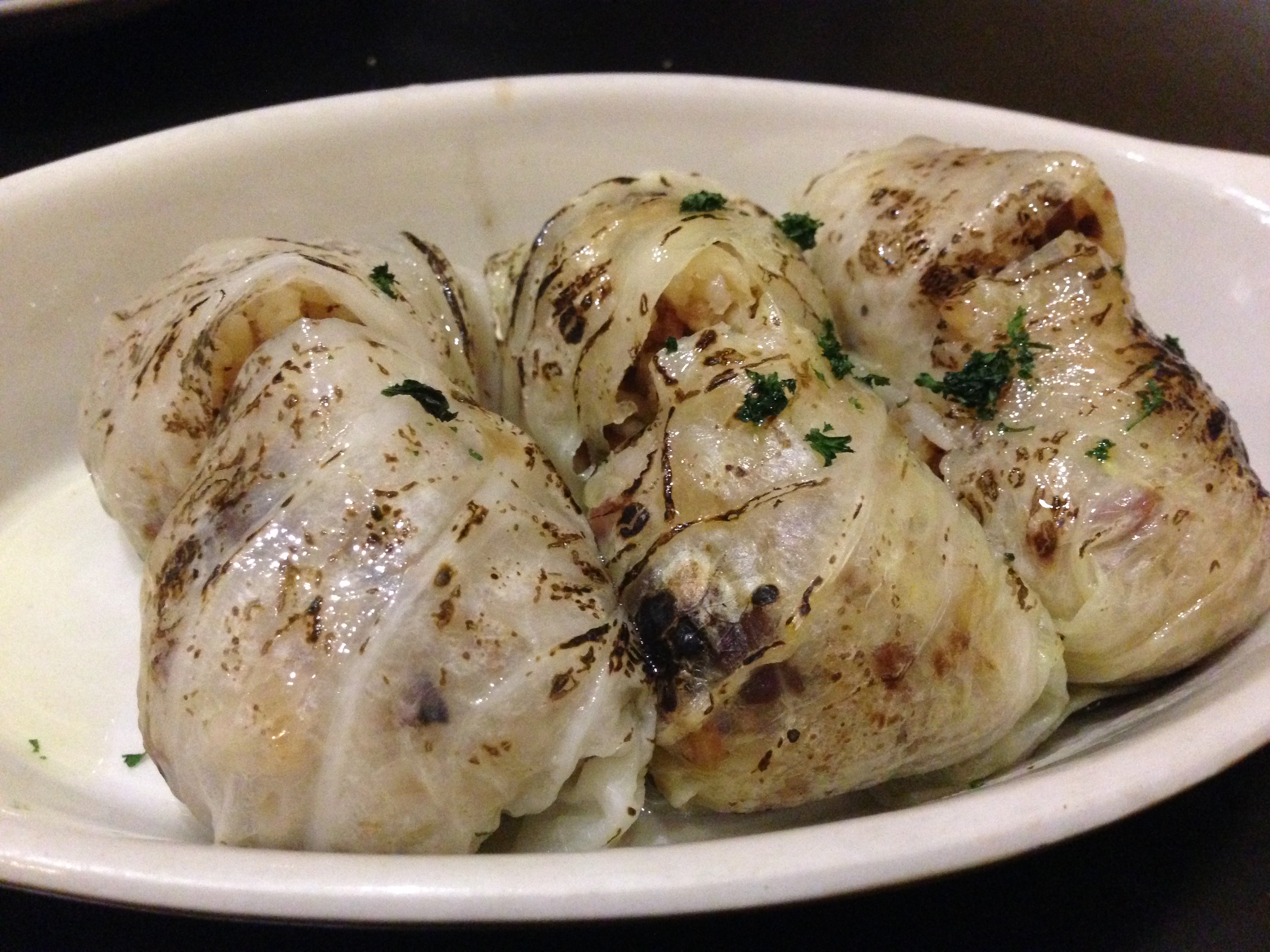 Rollitos de Repollo con Arroz (S$13) is rice, bacon and nuts rolled inside of cabbage. It looks like it was pan fried afterwards to give it some color and greasiness.