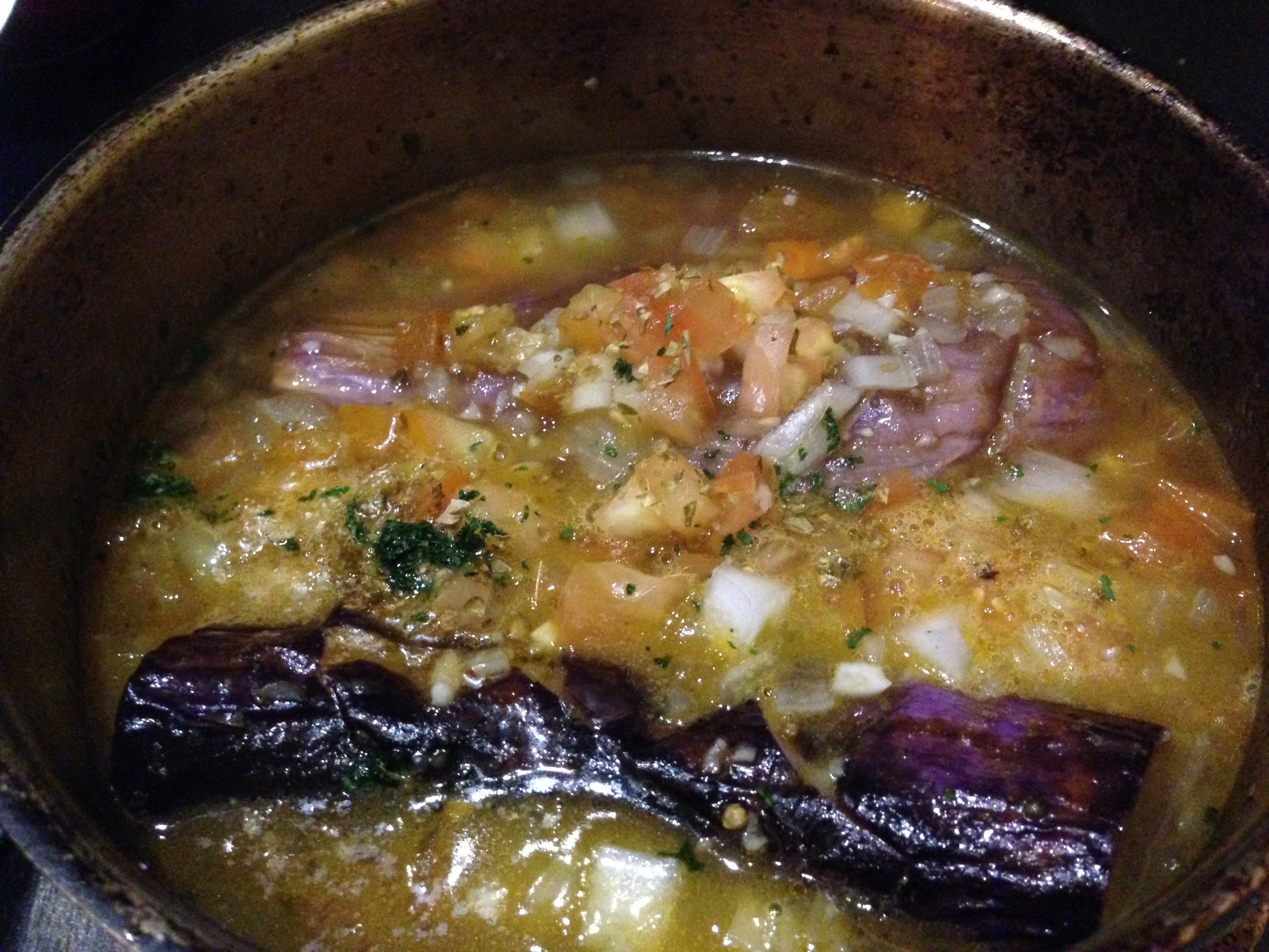 The star of this dish was not the eggplant, but the broth. The broth was so sweet and flavorful from onions, tomatoes and celery. It was just fantastic to drink the broth! The eggplant was well cooked also.