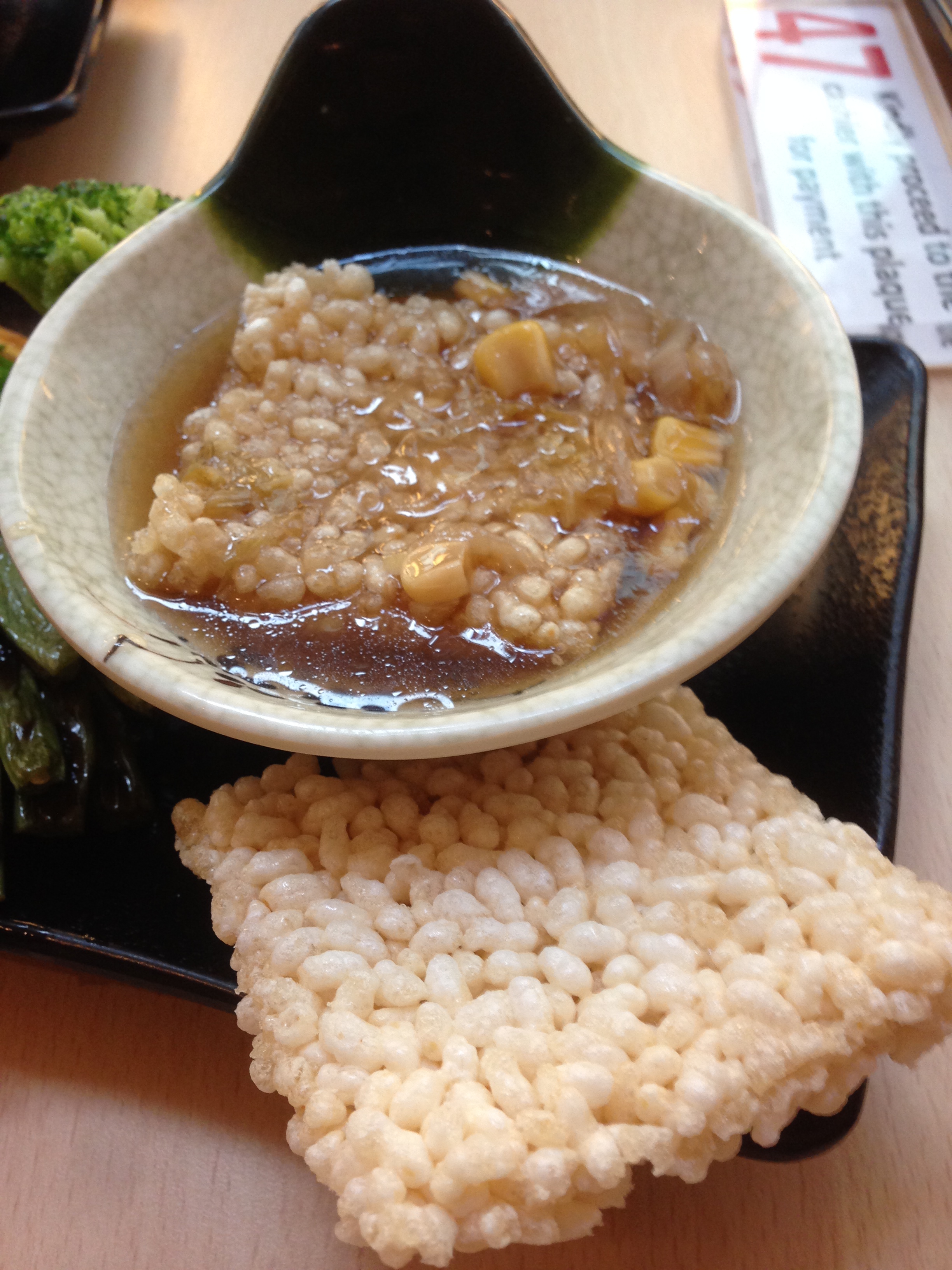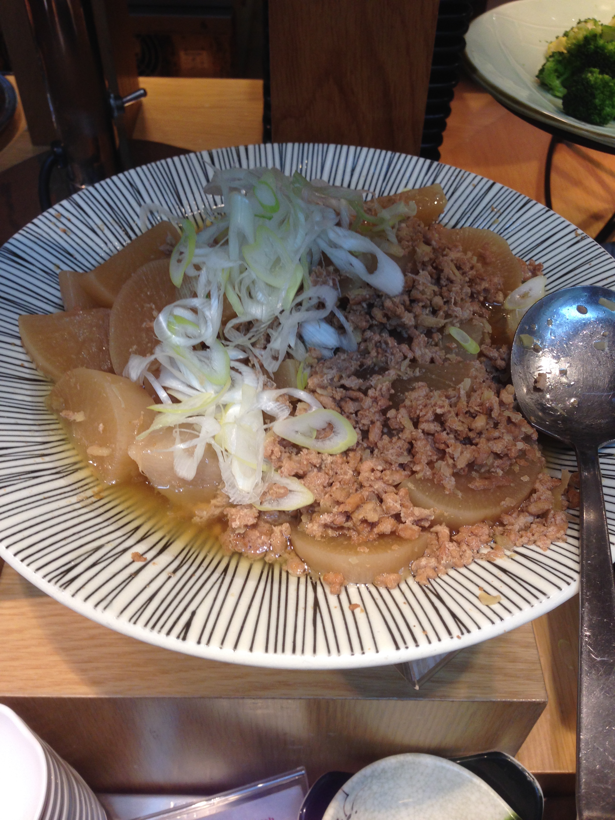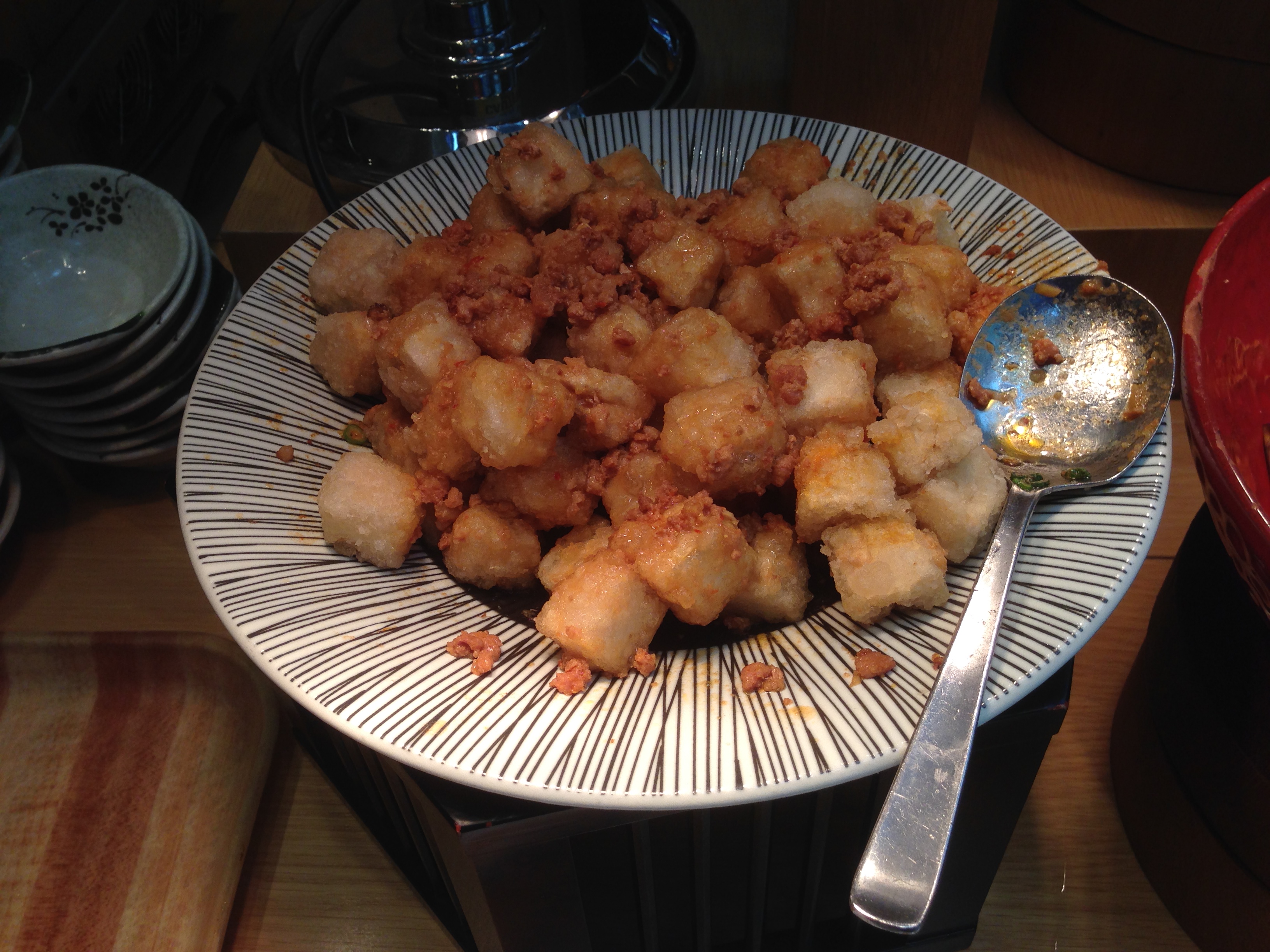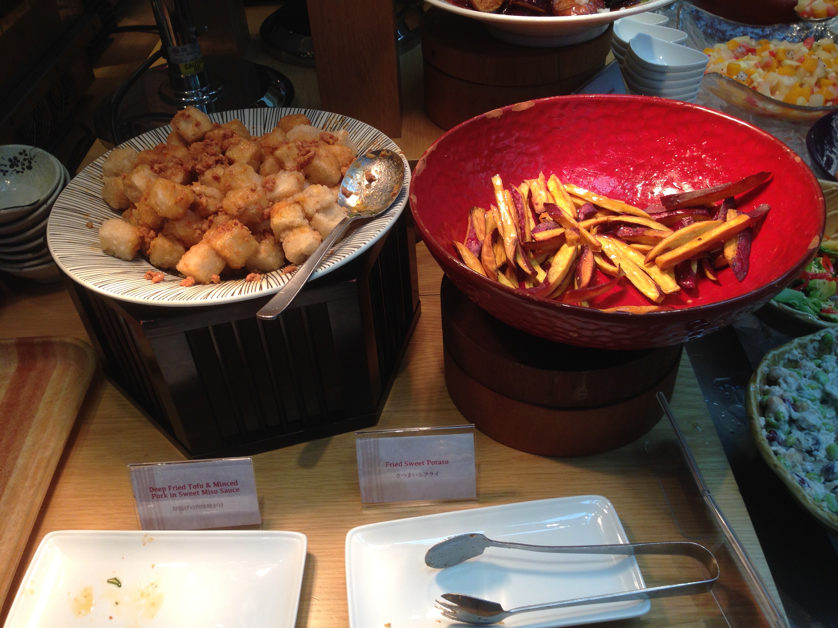 We placed our orders and headed for the appetizer bar. Below is Fried Tofu with pork mince in a miso sauce and on the left is Fried Sweet Potato sticks.