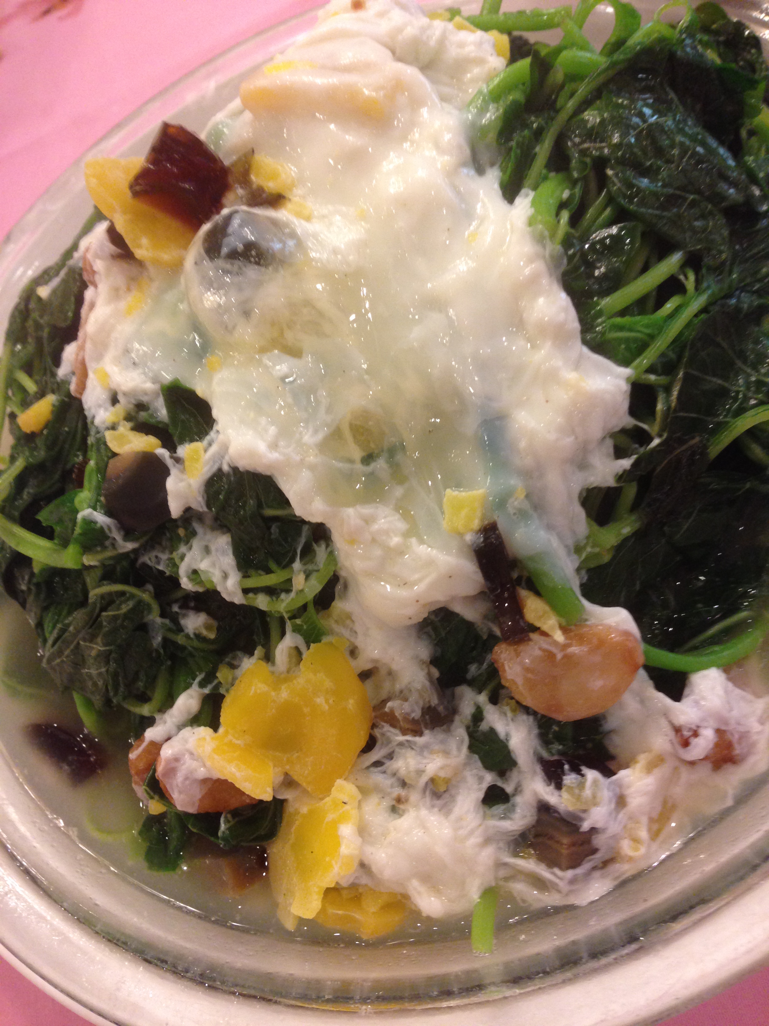 Spinach with Three Styles of Eggs. The Century Egg, Salted Egg and regular Egg. A nice combination.
