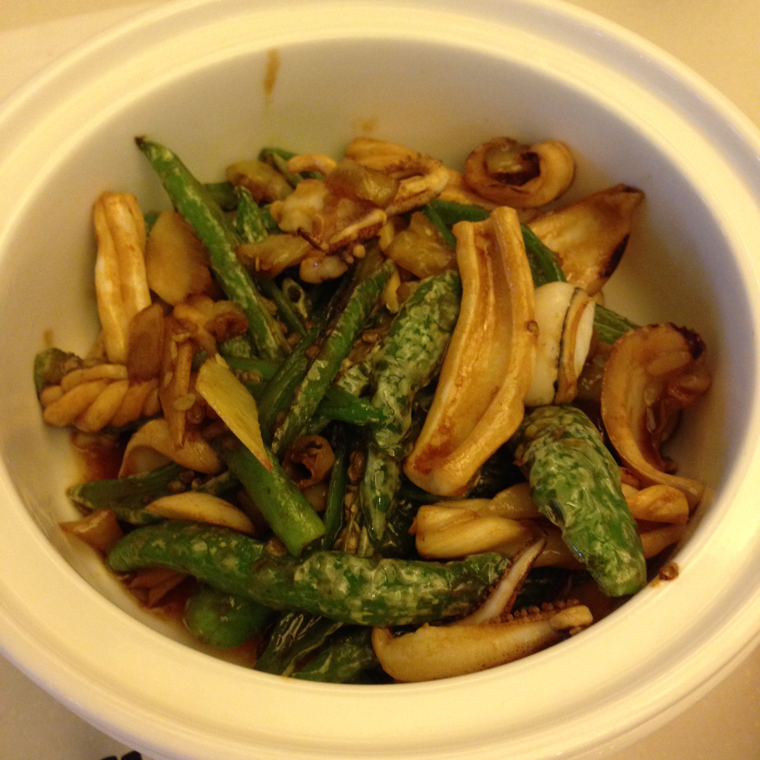 Stir fried squid with chili peppers. Quite fragrant and well done. Not too spicy at all.
