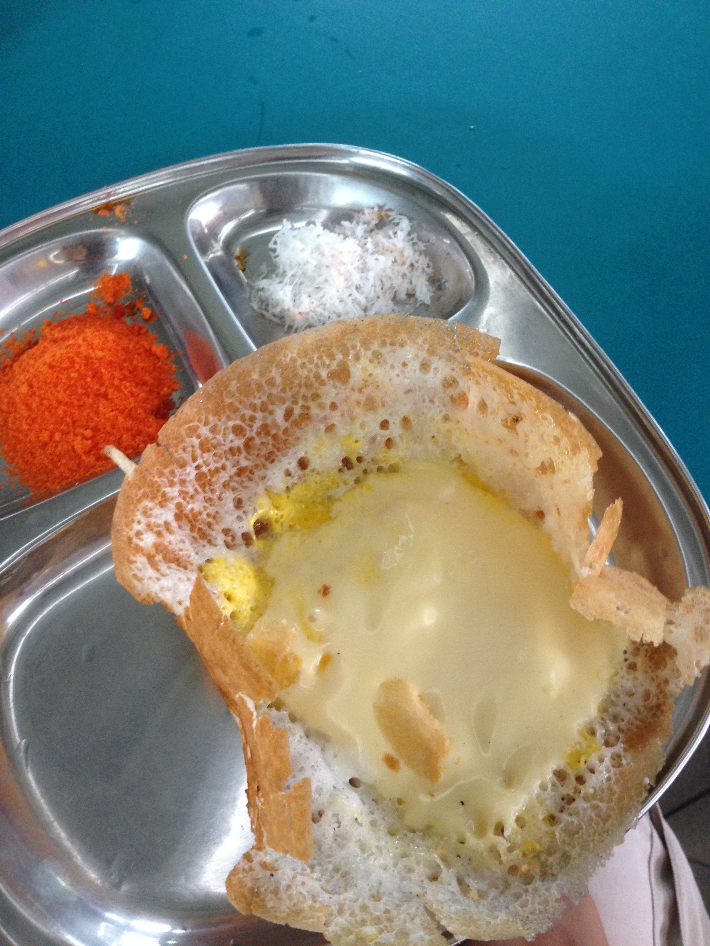 Then you add your ingredients inside. Me, I went with what they call the Princess Appam, which is egg, butter and cheese. You then take the sugar and coconut and spread it on the Appam as you eat it.