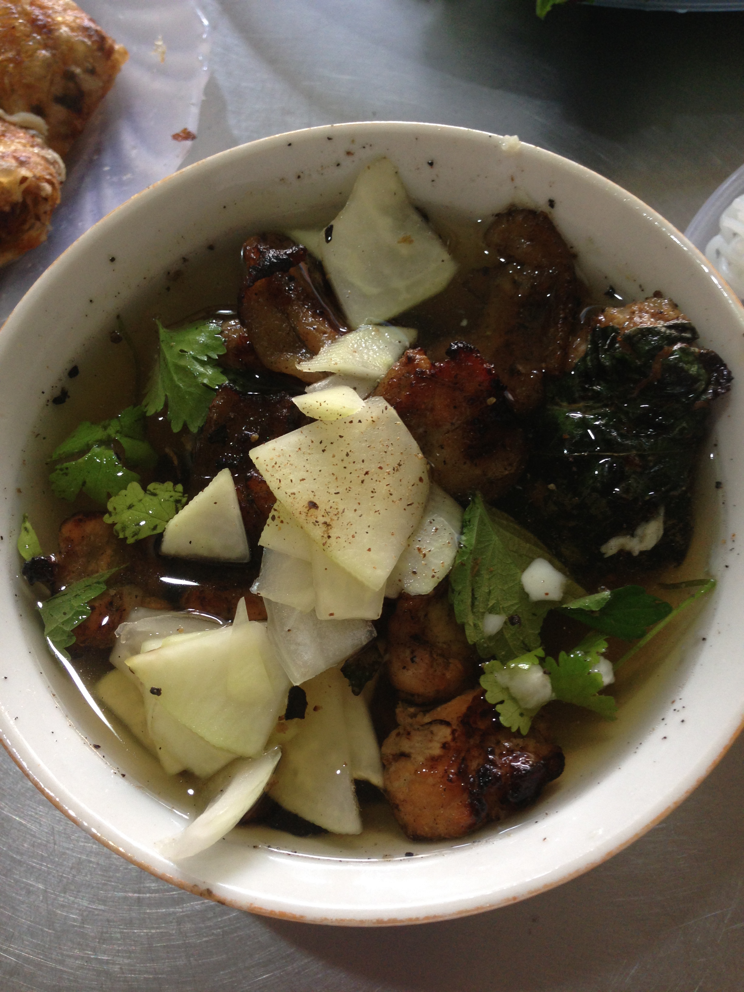 How to eat it? You take some greens and some Bun, and soak it in the broth. Then eat.