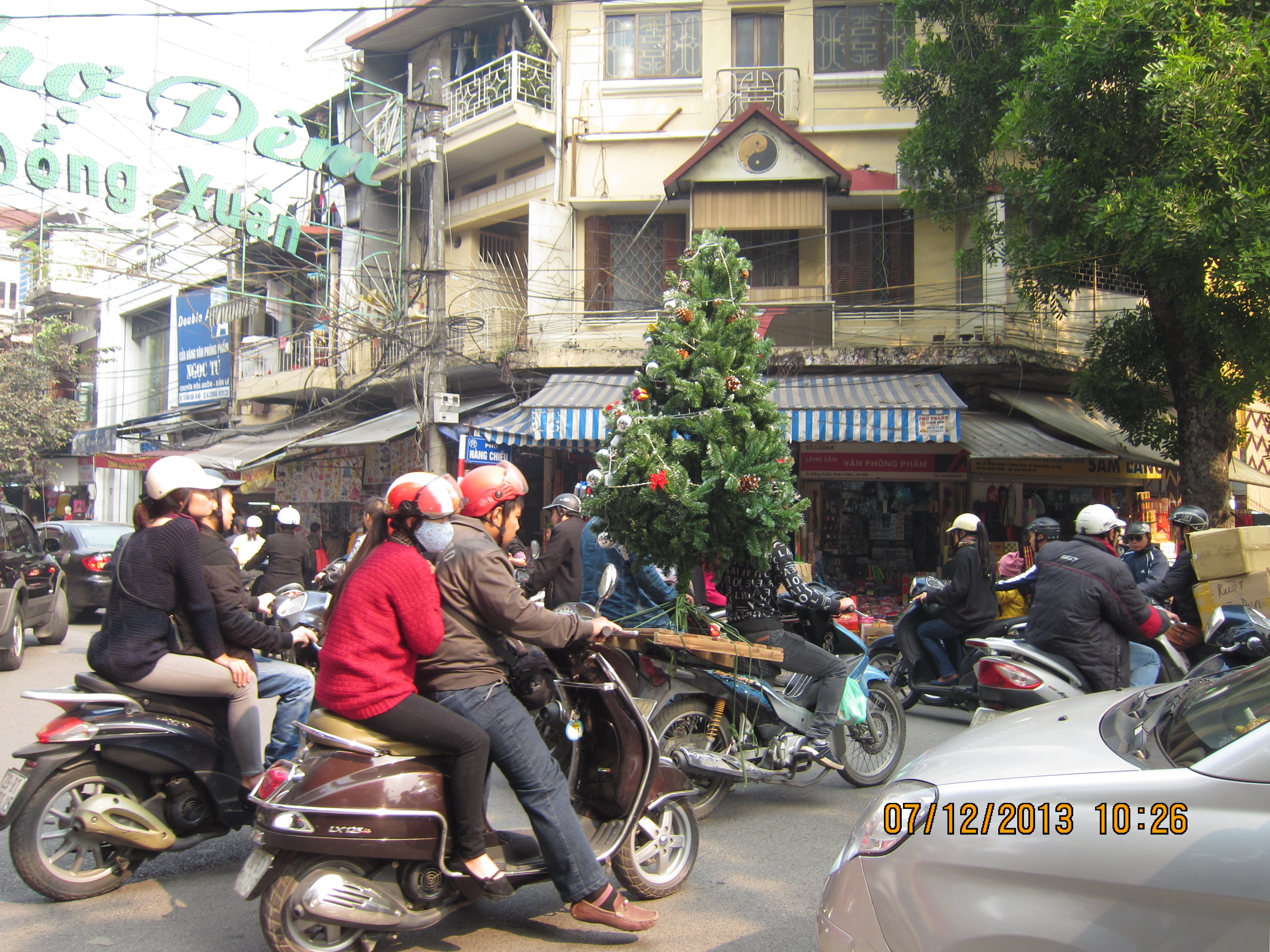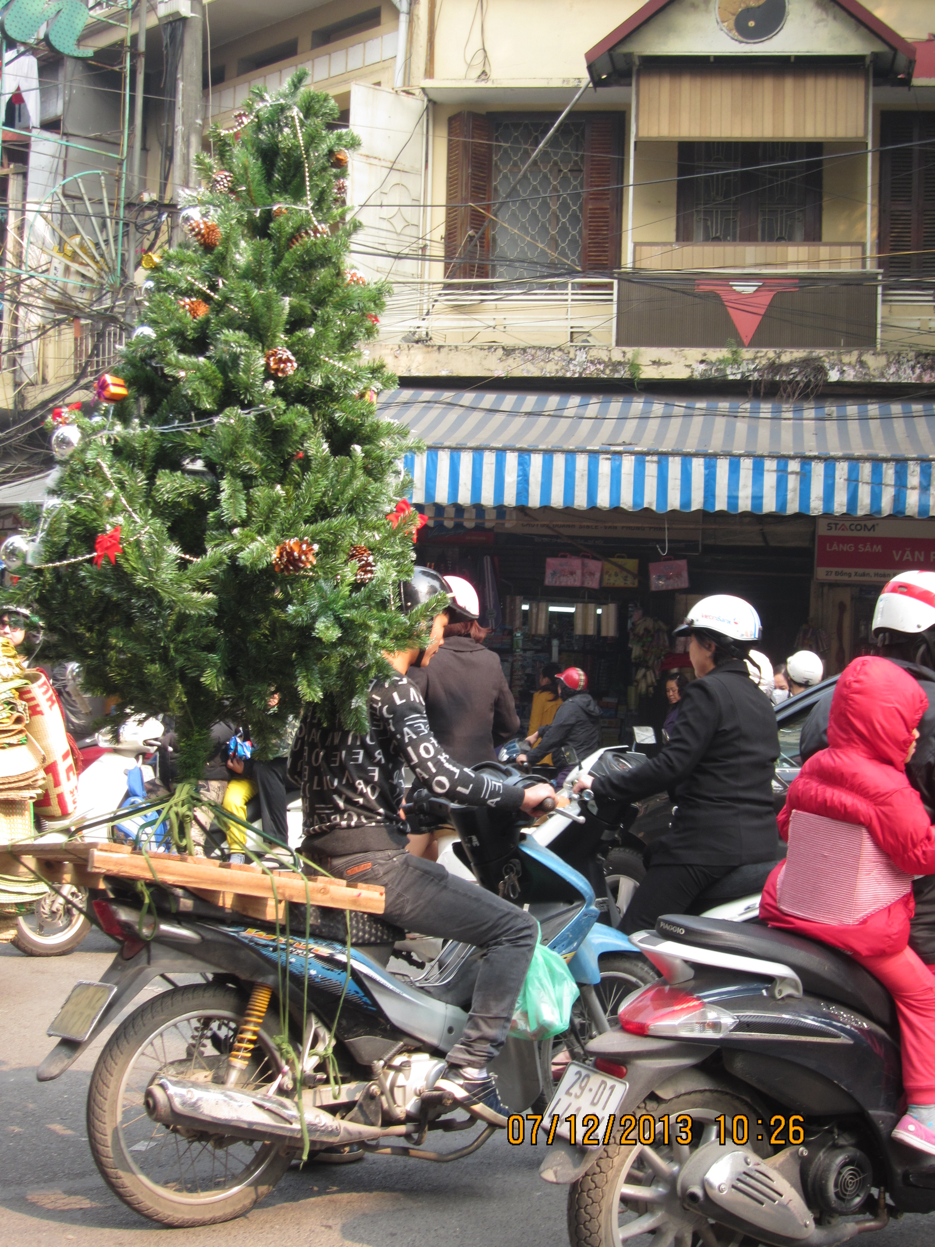 We headed out to the Dong Xuan market early in the morning to try to get some deals and look for some things. After a little shopping, we headed to Hang Ma, which had a lot of Christmas shops selling trees, ornaments, hangings, etc. It was an interesting shopping experience, and we even saw a Christmas tree being delivered on a motorbike!