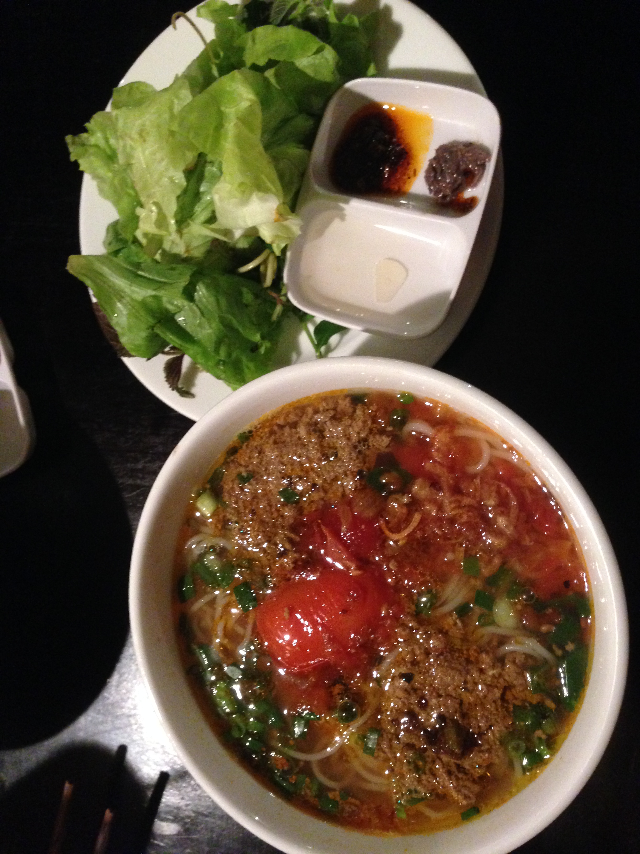 We went looking for items we wanted to try when we came, but knew with out time constraints that we weren’t going to get to eat it. So first up was Bún Riêu Cua, which is a tomato based broth, infused with herbs and then rice vermicelli is added along with crab paste on the top.