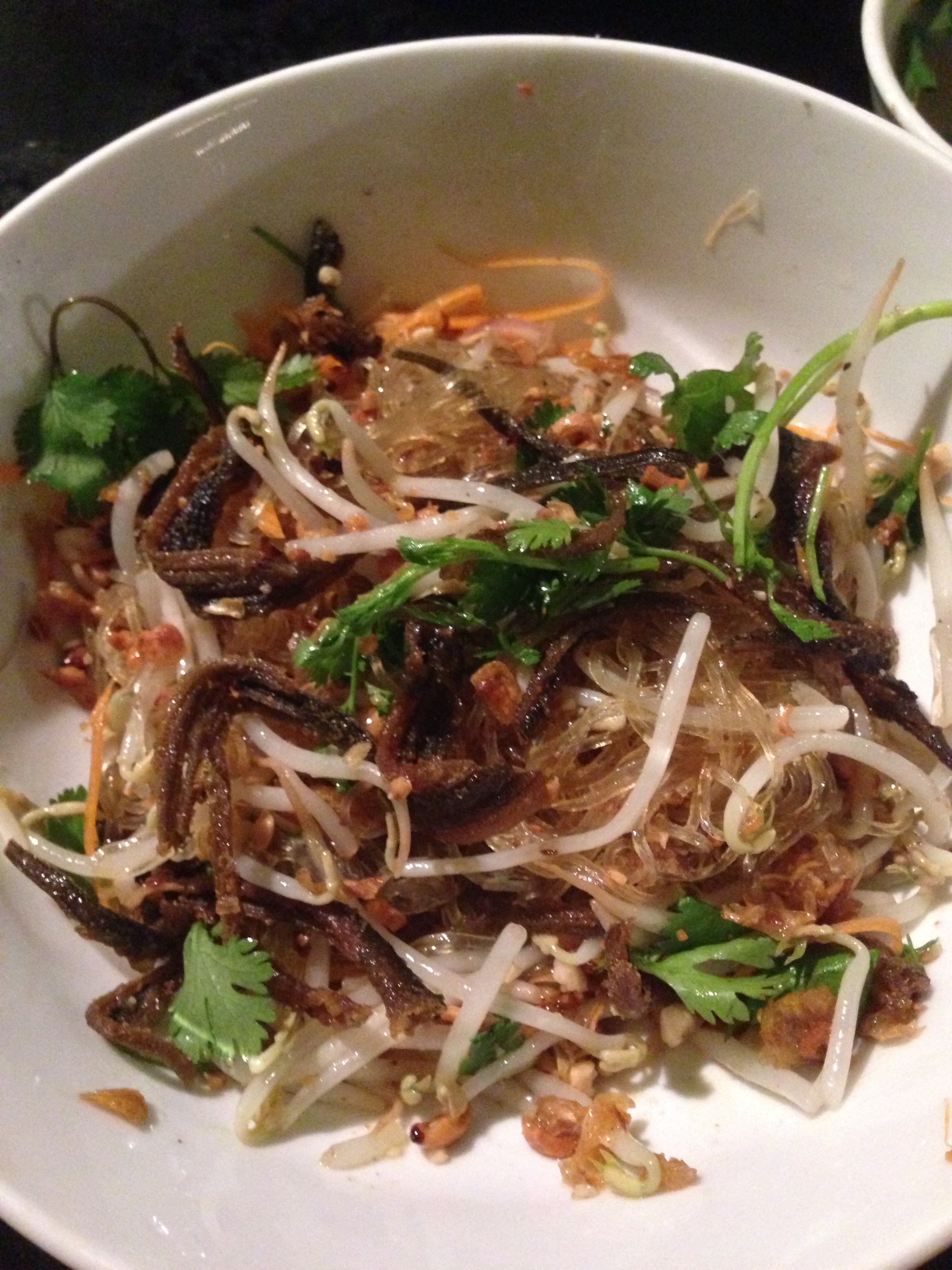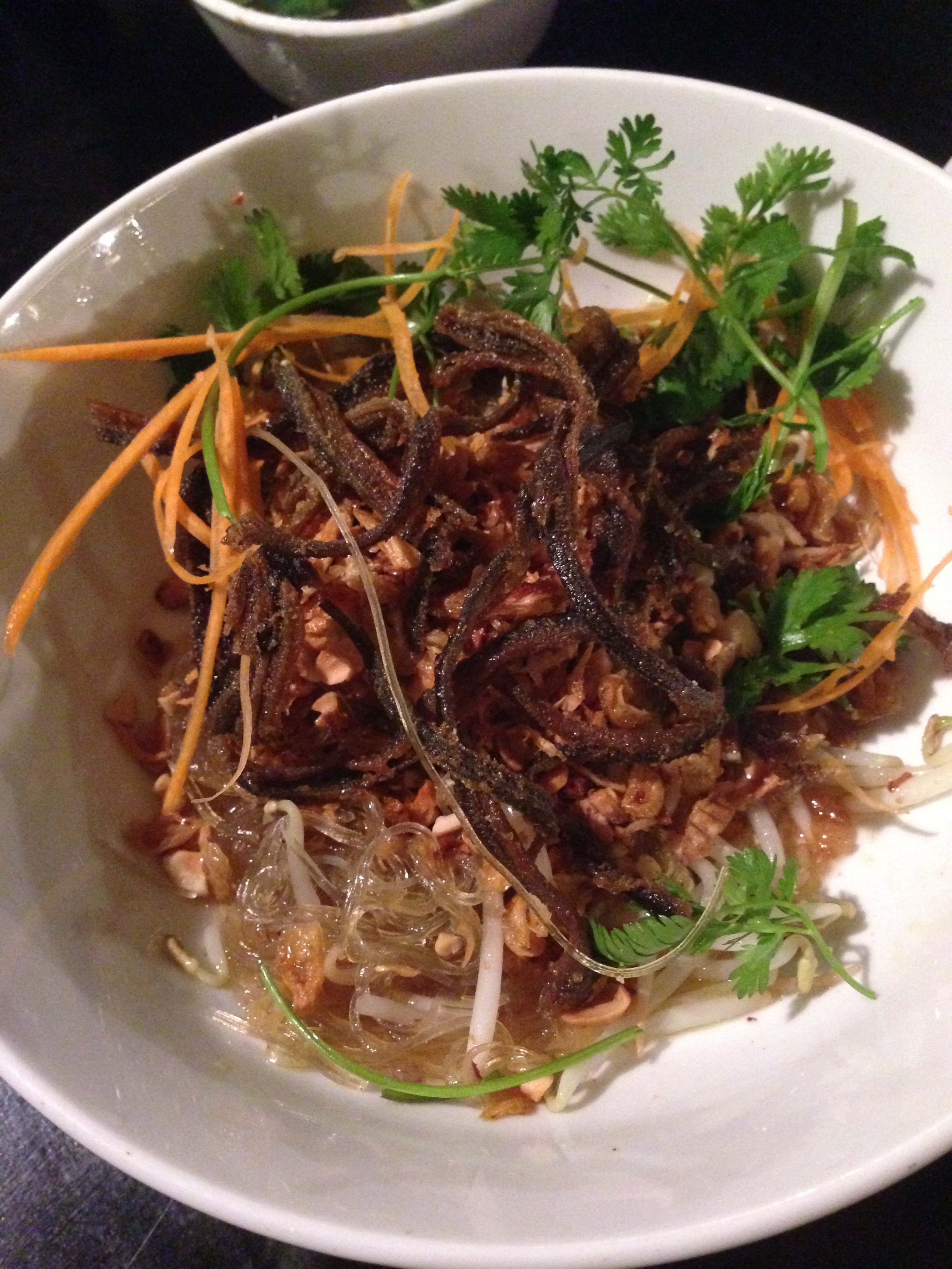 Next up was Miến Xào Lươn, which can be taken as dry or soup form. I chose dry. This is a glass noodle dish, and on top are herbs, vegetables and little crispy fried eels.