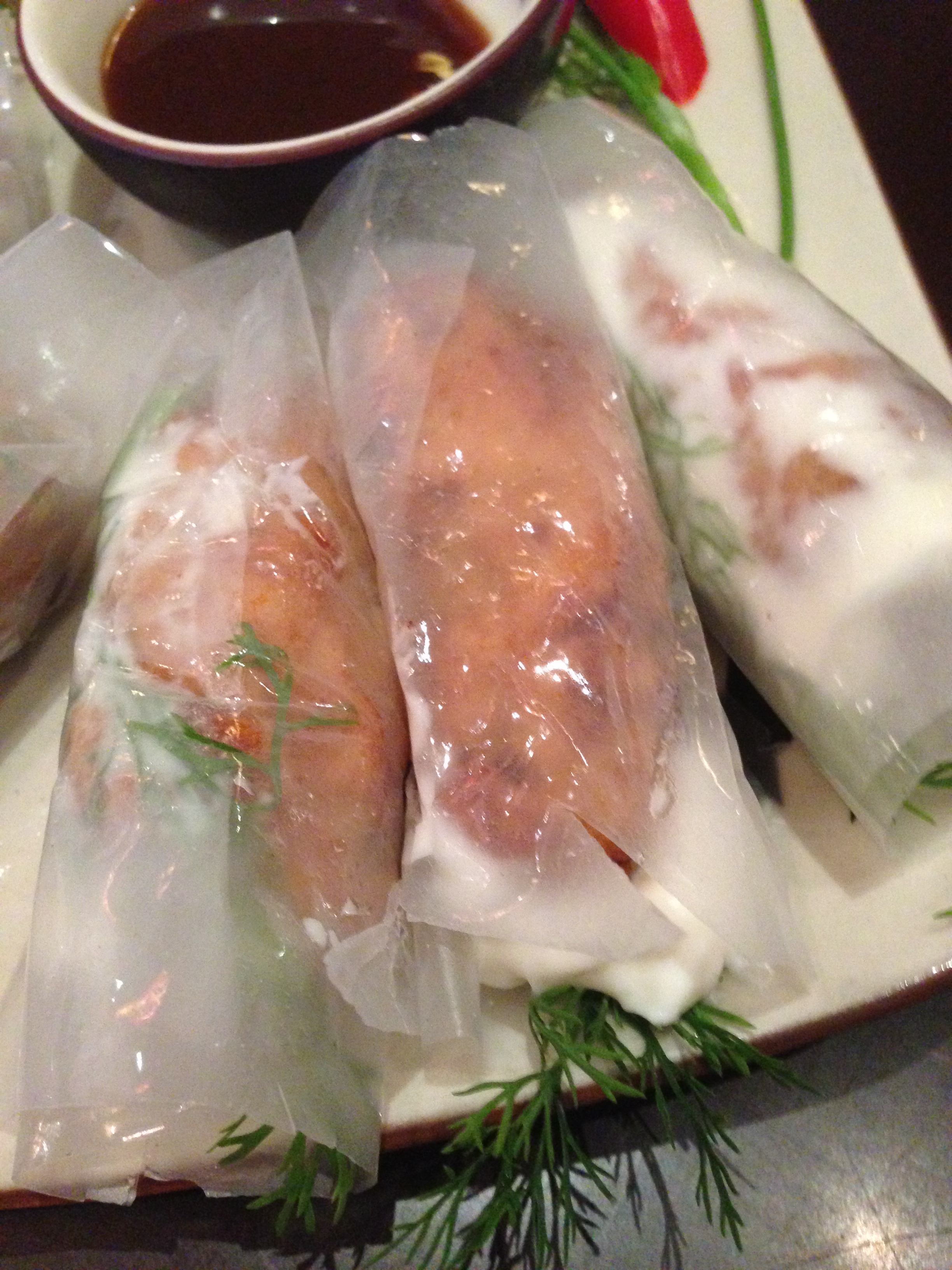 Lena wanted more rolls, so we decided on something a little different. Nem Cá Xa Lộ, which is Battered and Fried Catfish with Wasabi Mayo and Dill in a Rice Paper Roll.