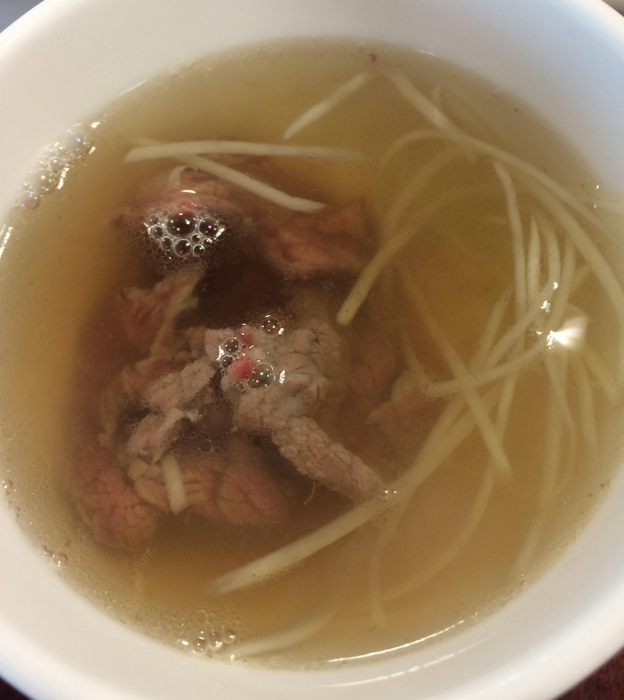 So how you put this together is you place the beef in the hotpot for a few seconds, then place it into your bowl There you put julienned ginger and then scoop some of the broth in there. You then let if finish cooking and dip the beef in a mixture of sauce that you put together on your own.