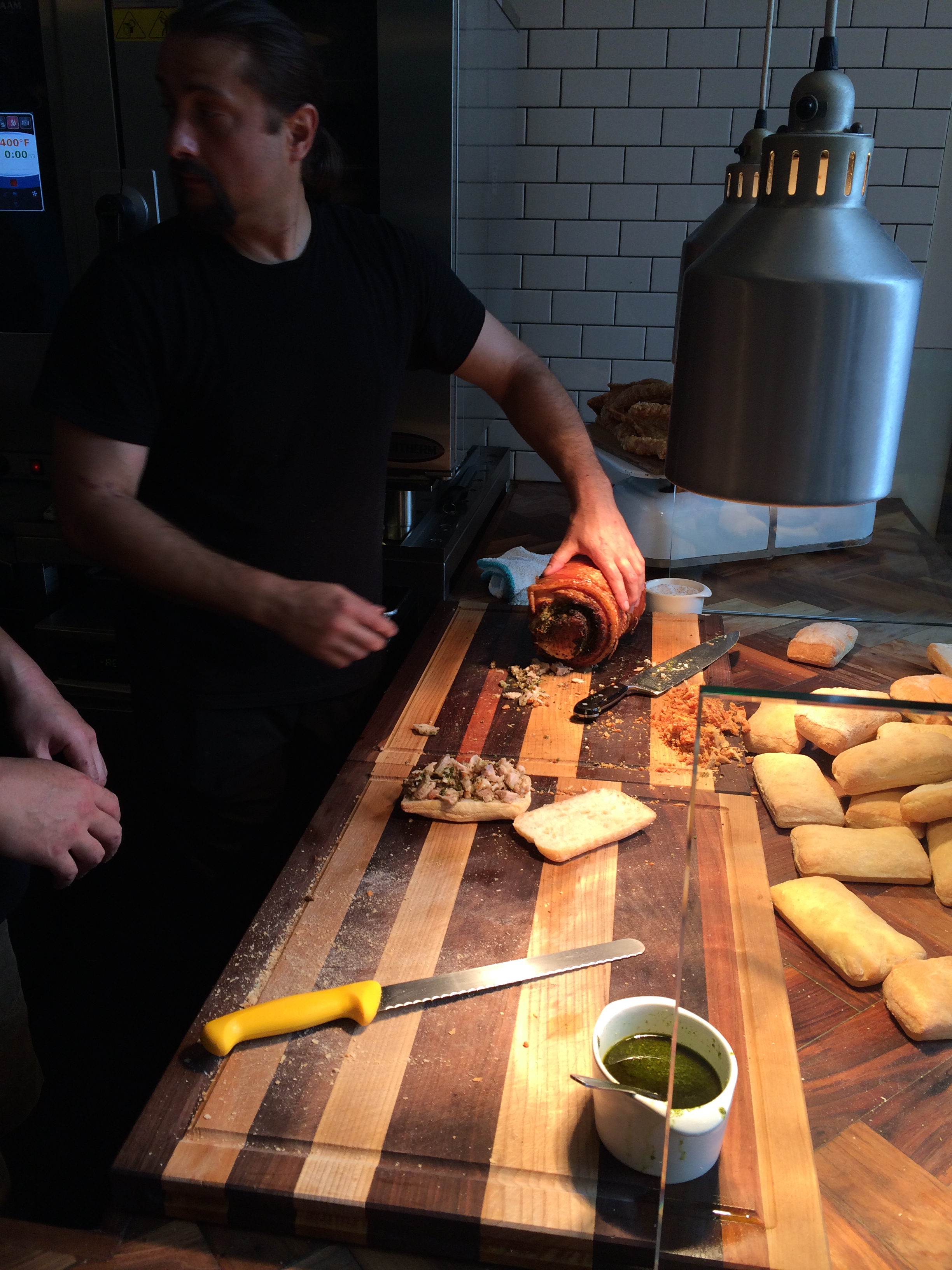 So the Porchetta sandwich that they are known for is the Pork rolled up, with crispy crackling. They slice the pork and then add the crackling to the sandwich. Sounds great!