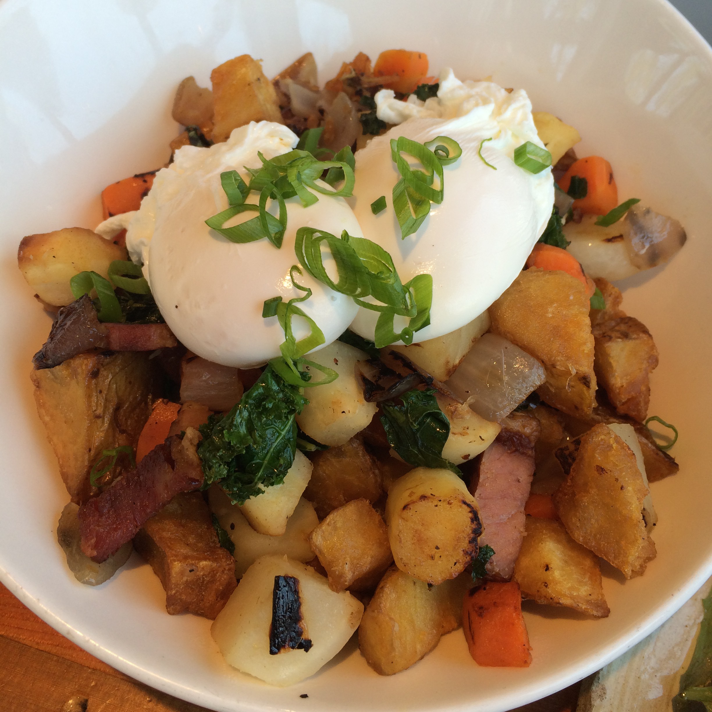 Here is Root Vegetable Hash. With 2 poached eggs. Real nice!