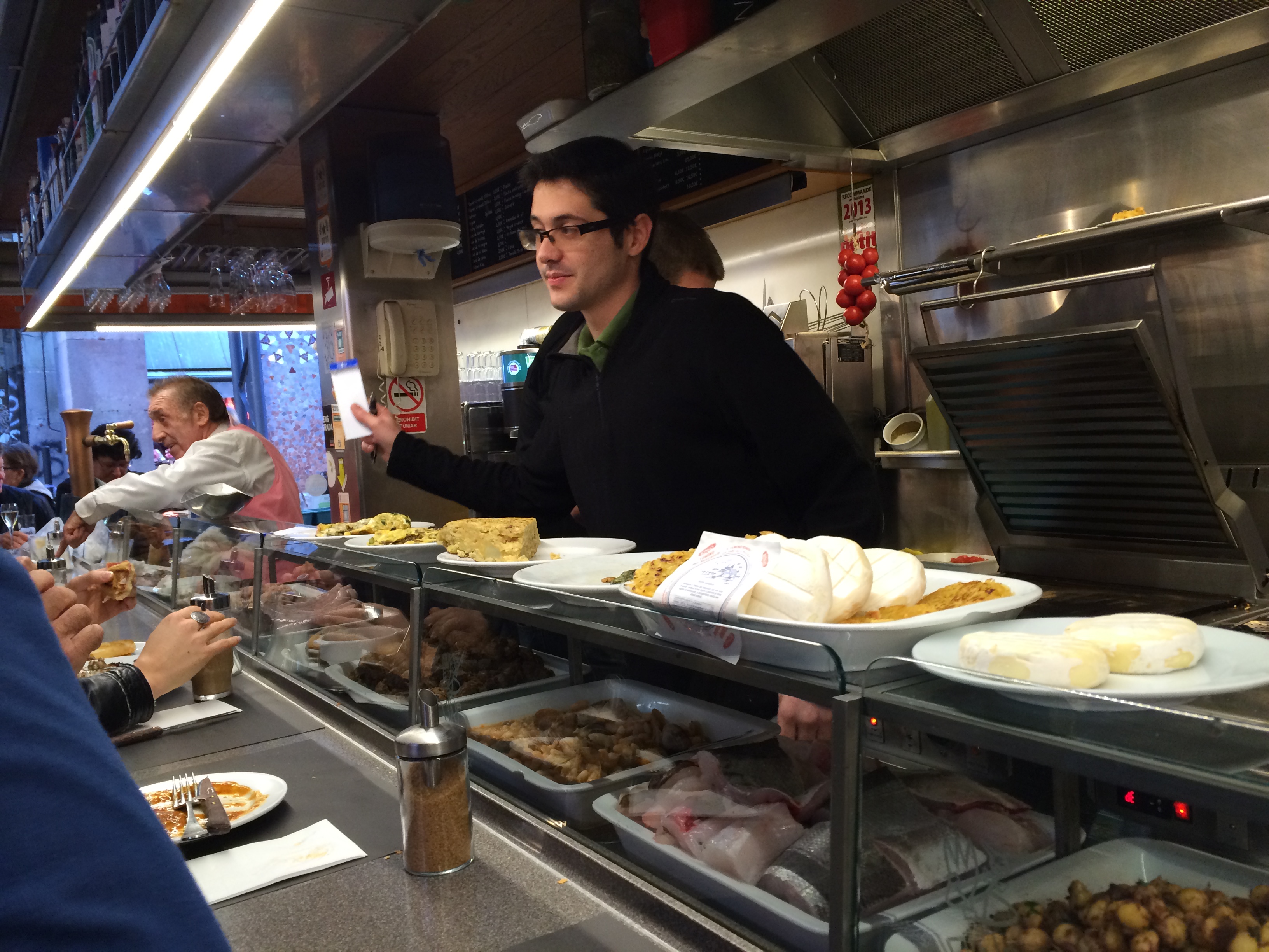 And once you get your seat, enjoy the show! And try to get a seat by Pinotxo himself. For breakfast he runs the espresso machines at one end of the stall. You see him below in the pink vest.