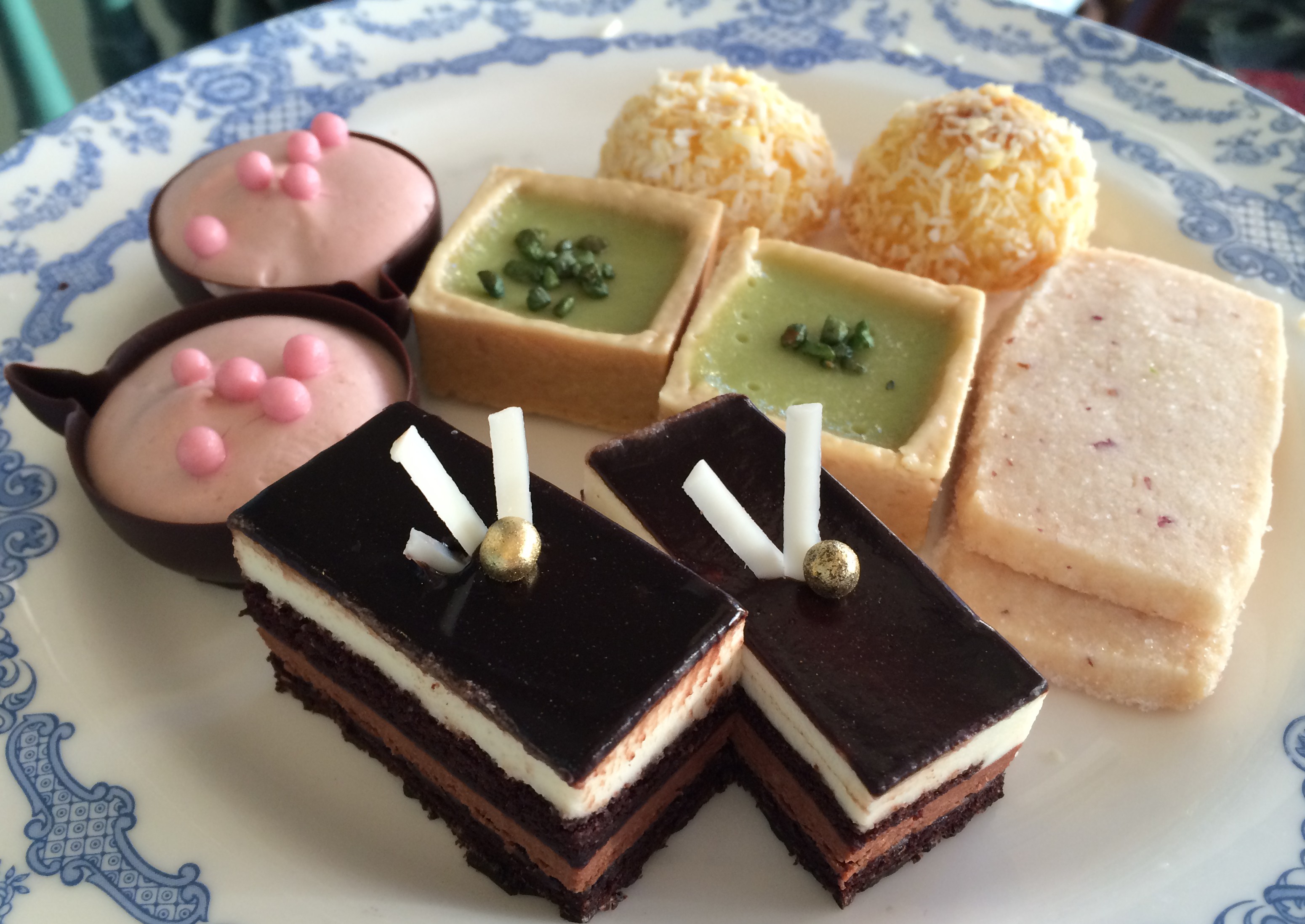 The top level is sweets. Chocolate Delice, Tropical Lamington, Raspberry Marscapone Mousseline, Pistachio Cremeux Tart and Rose Petal Shortbread. I really liked the Pistachio Tart here.