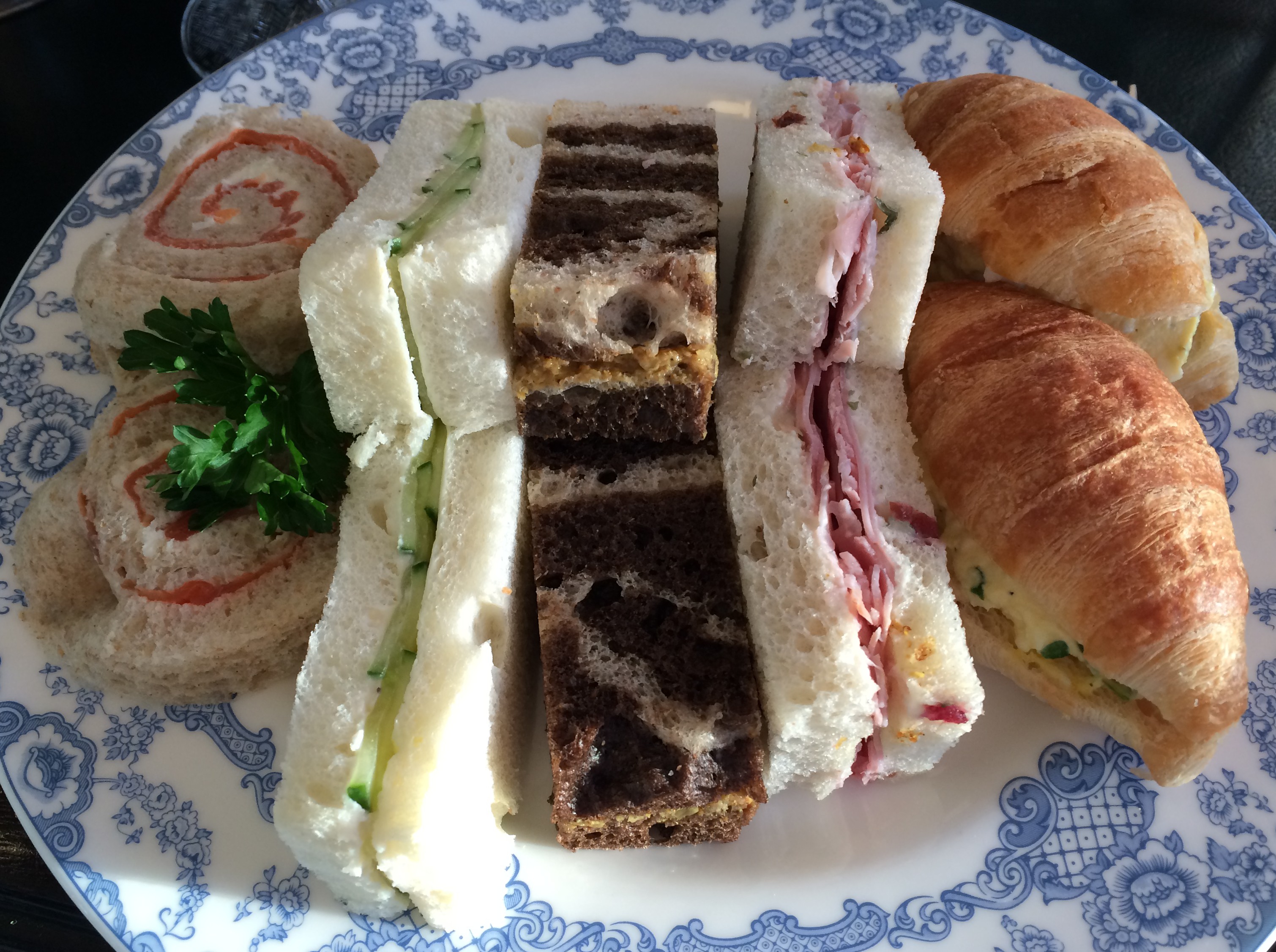 And finger sandwiches too. Salmon Pinwheel with Dill Cream Cheese, Cucumber and Ginger Marscapone, Moroccan Spiced Chicken on Marbled Rye, Honey Ham with Tarragon Dijonnaise and Egg Salad Croissant.