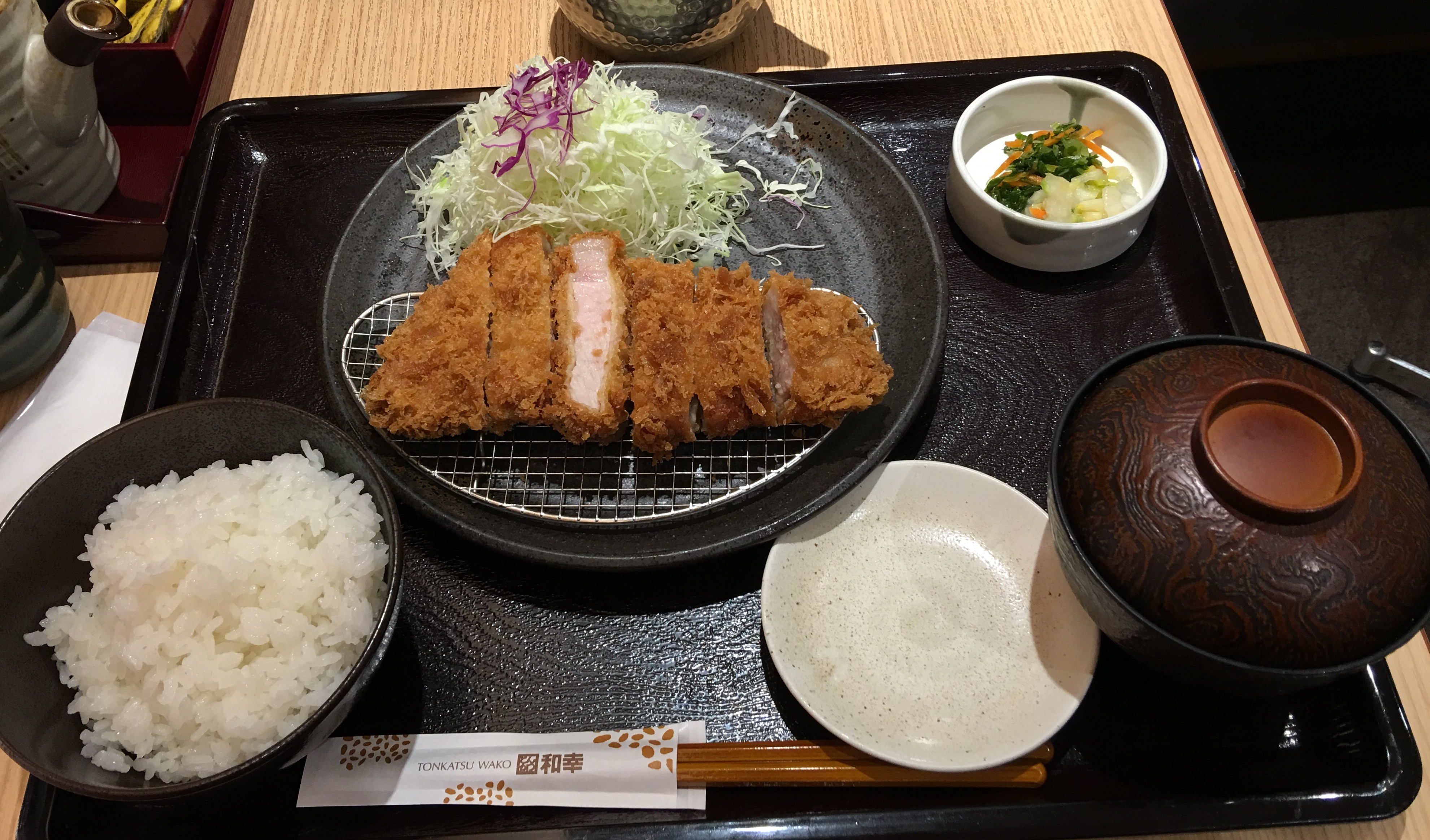 It’s the usual set. Rice, Miso, Pickles and the Tonkatsu.