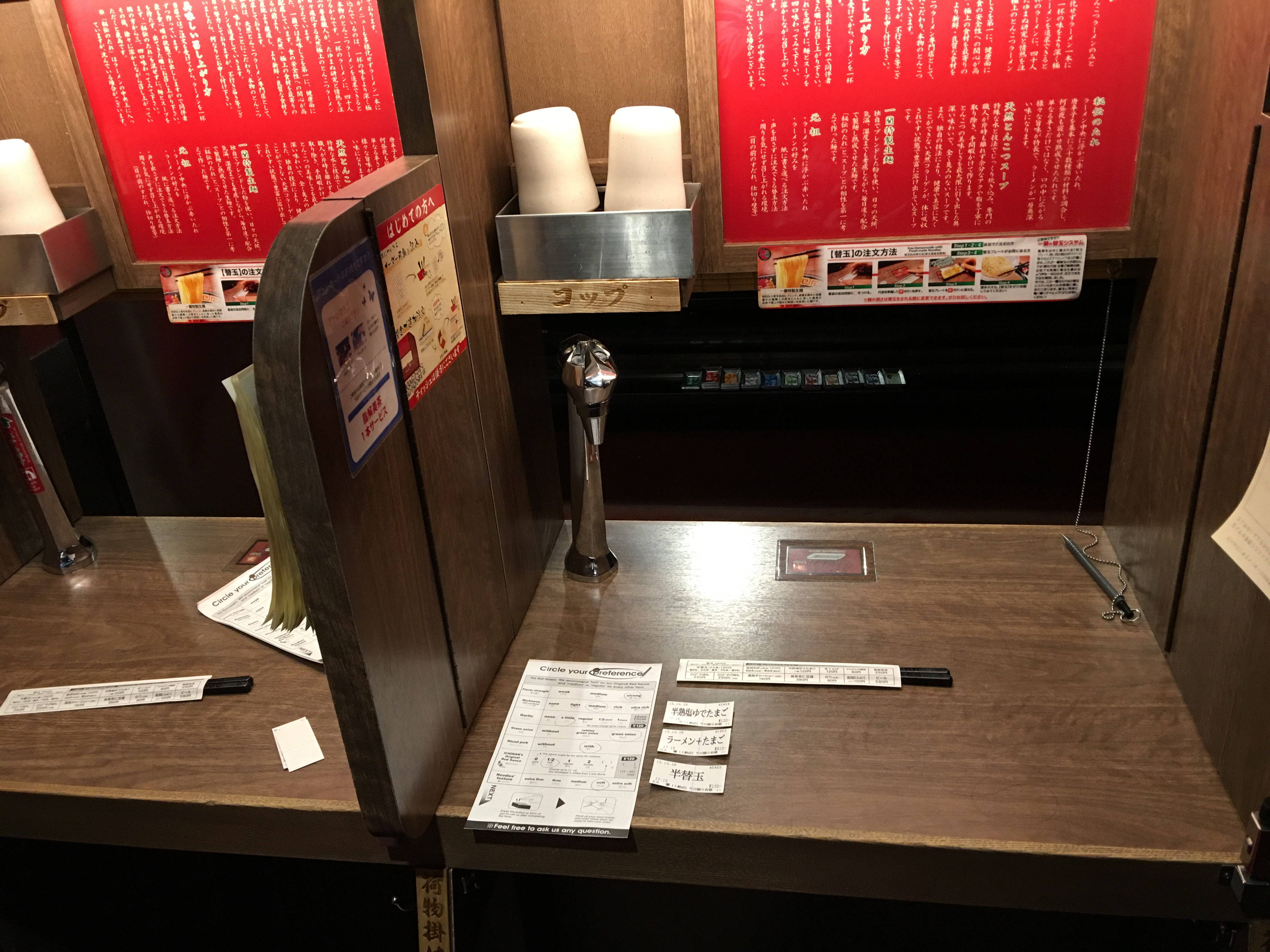 Our first stop was in Ueno at Ichiran. They have a few shops around, and what I love about Ichiran is that it’s that Private Ramen Dining experience. You love your Ramen, and you want to eat it all by yourself, without someone next to you that can see you slurping away. So what is it all about? You’re separated by a partition to the next diner and there is a curtain that is pulled to ensure your privacy. It’s quite an experience.