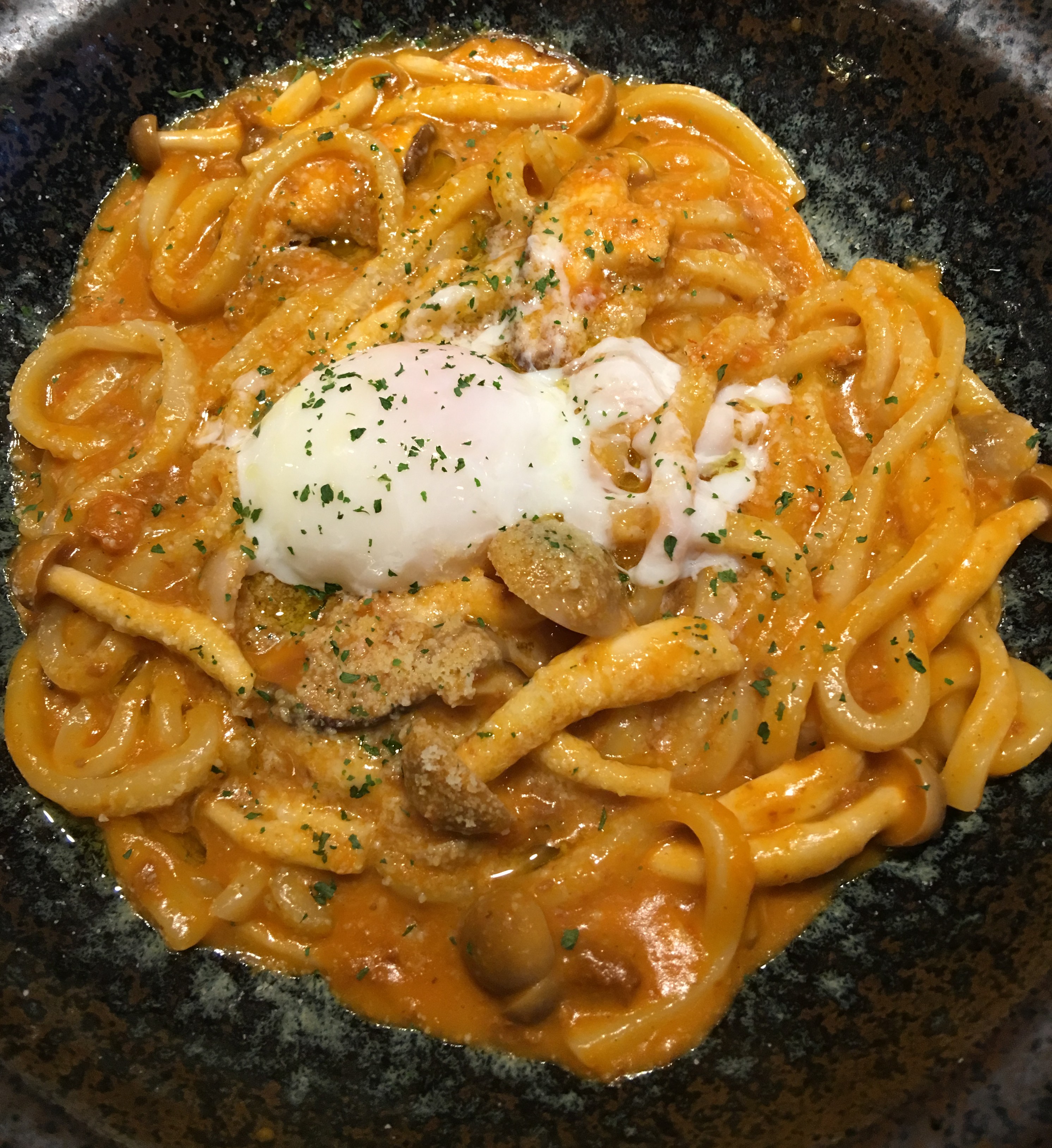 I decided to embrace the Japanese-Italian fusion, and a lot of people seemed to order this one. It is a tomato sauce with Japanese mushrooms and an egg with Udon. Such a great taste!