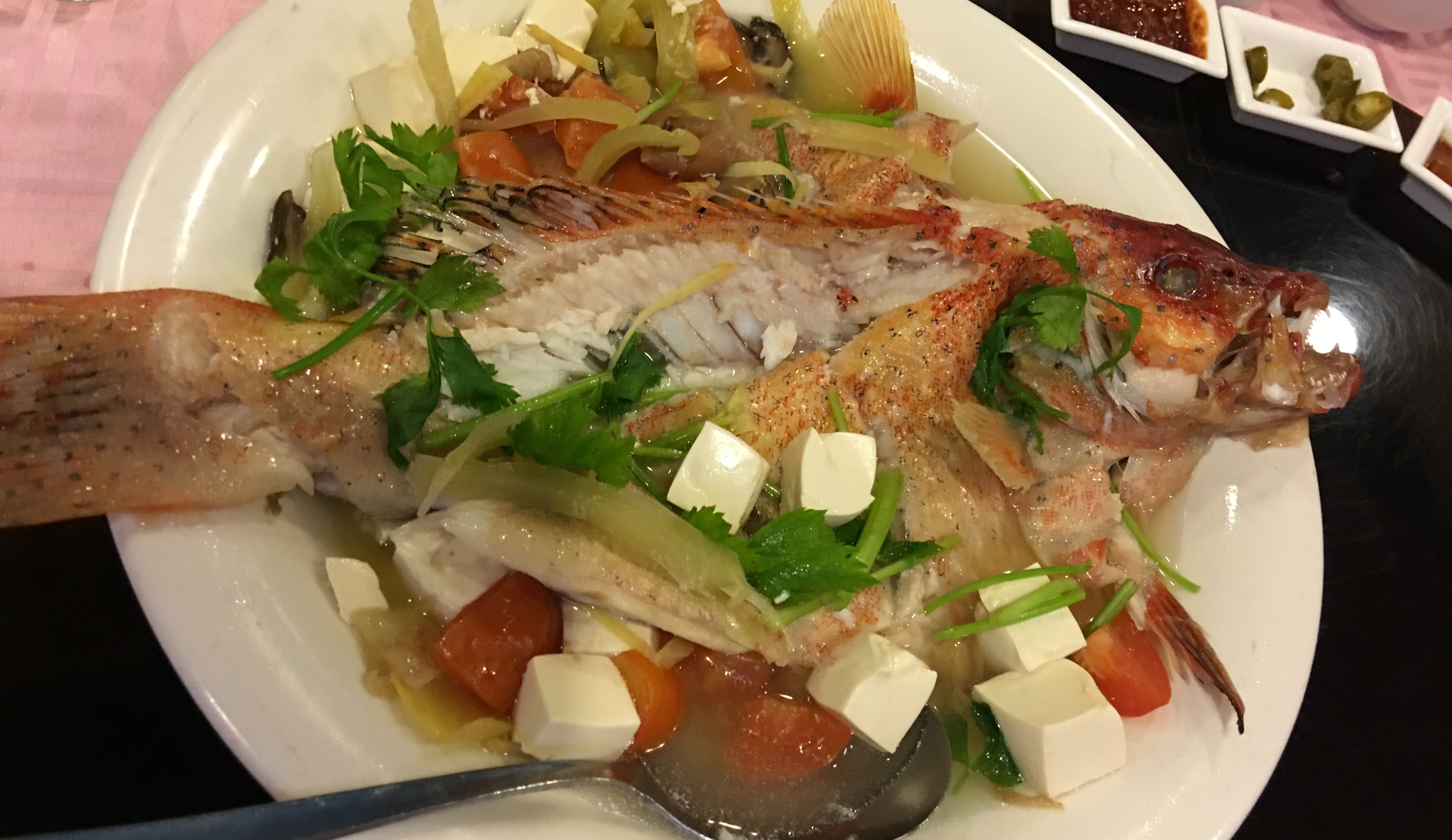 A Steamed Grouper Hokkien style with the Tofu and Tomatoes. Good fish. A little over though.