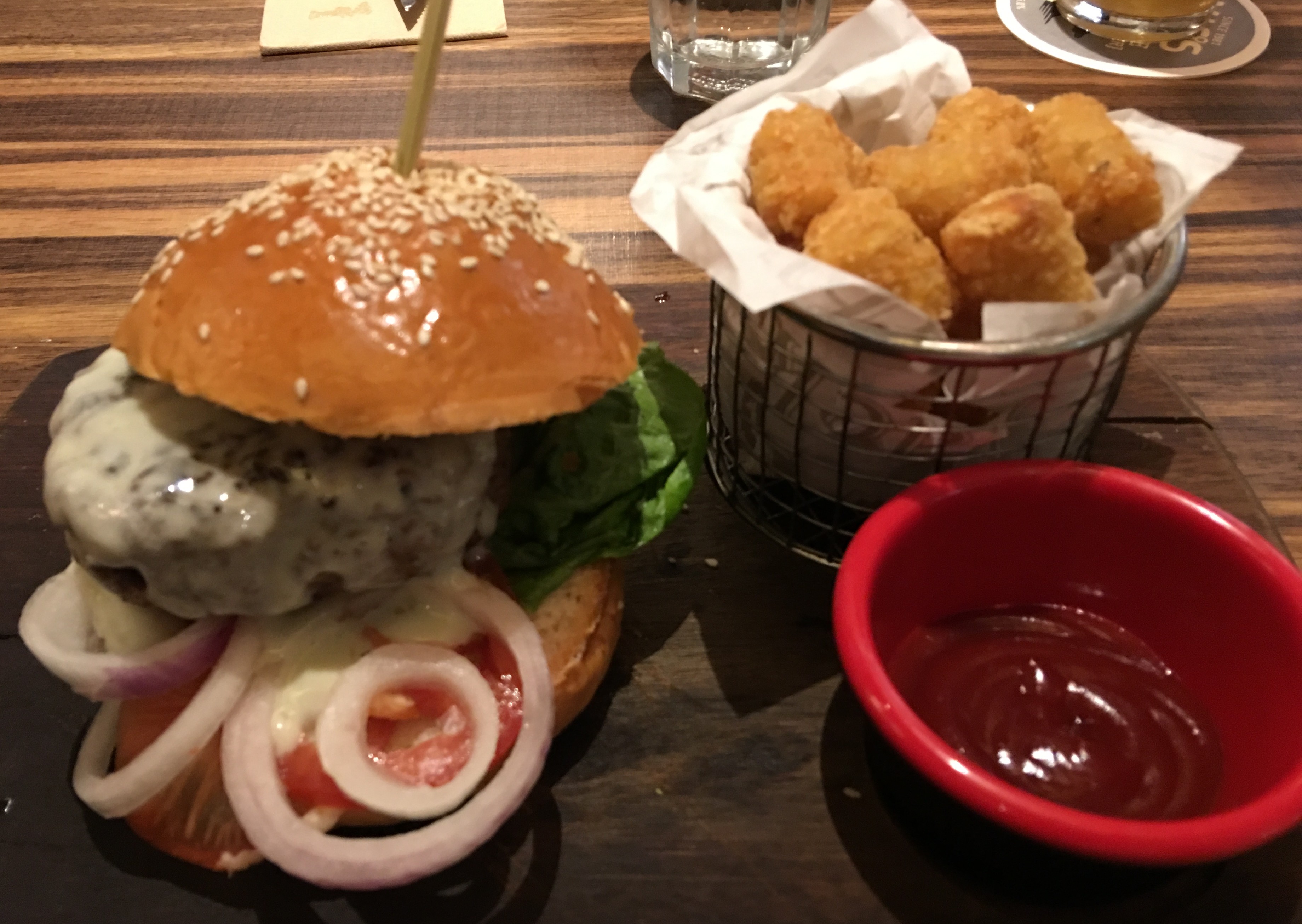I decided to go for the Black and Blue Burger.  It comes with Tater Tots!