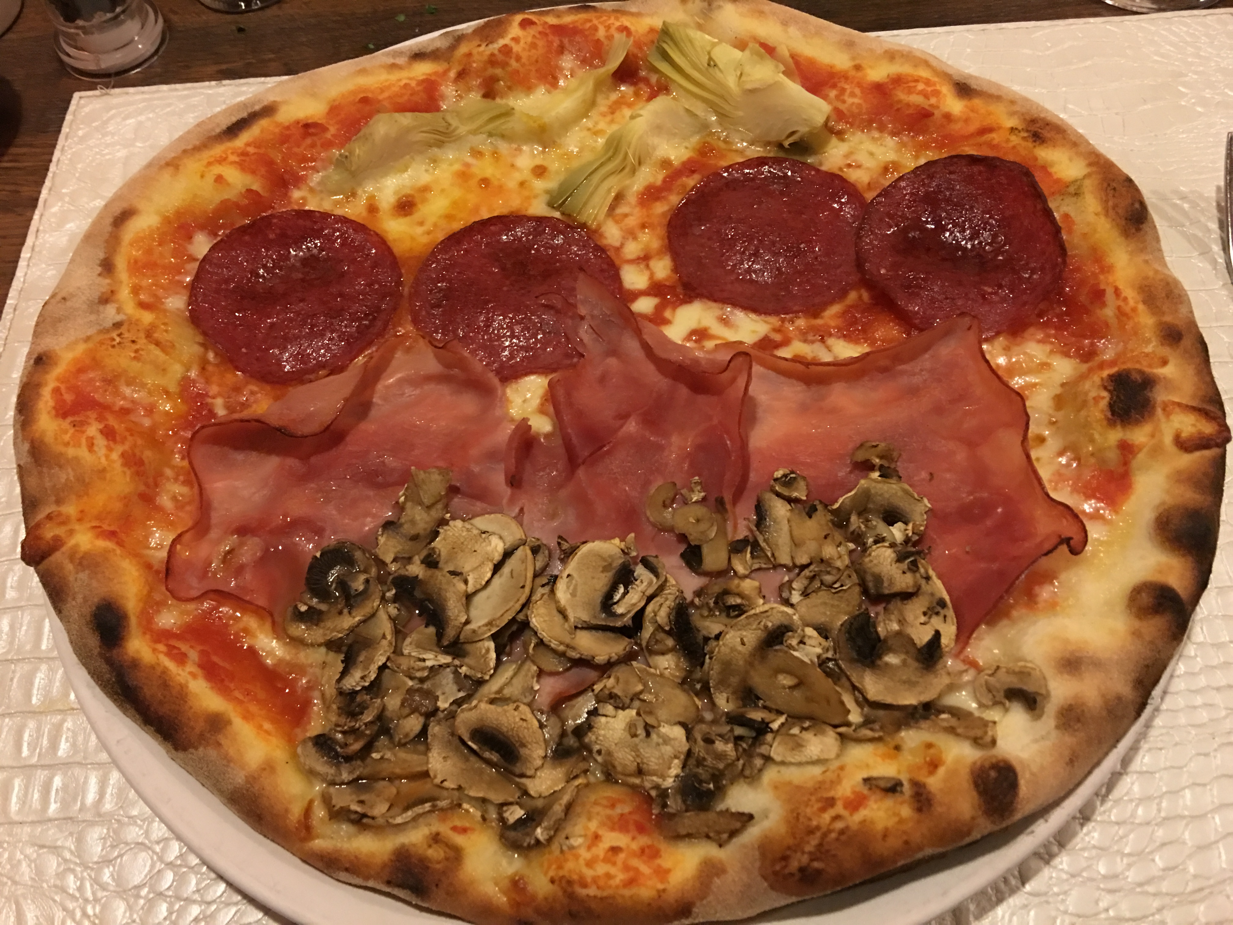 The pizza was real good. Artichokes, Salami, Smoked Ham and Mushrooms. The crust was chewy and it was quite good.