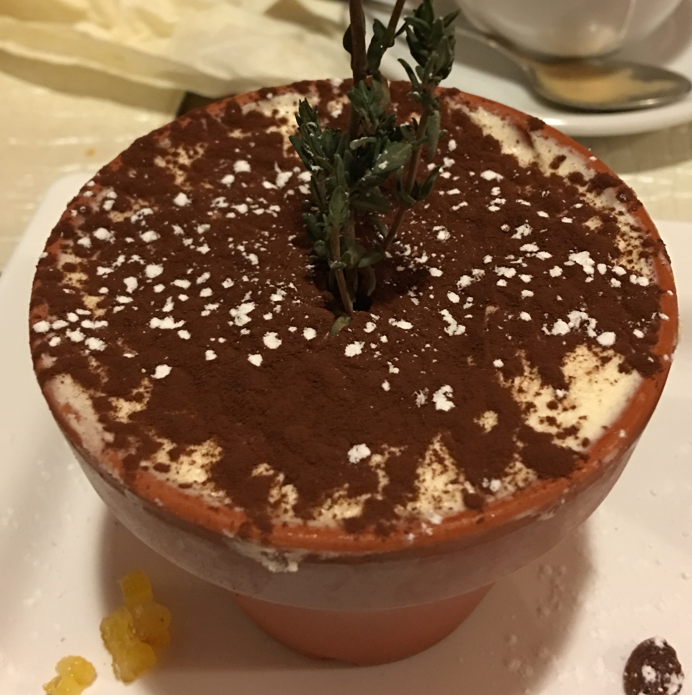 Tiramisu was interesting. Plated as a pot of dirt.