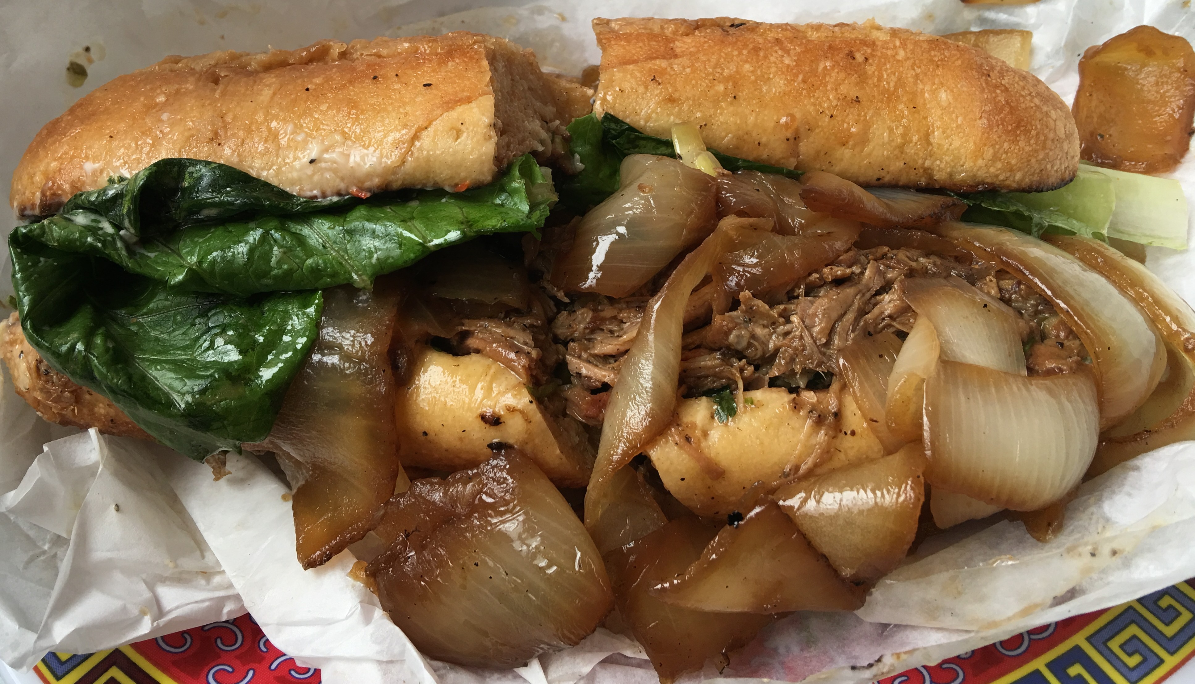 This is the No. 2, the Caribbean Roast. It is Pork Shoulder with Onions, Jalapenos, Romaine Lettuce and a Garlic Aioli.