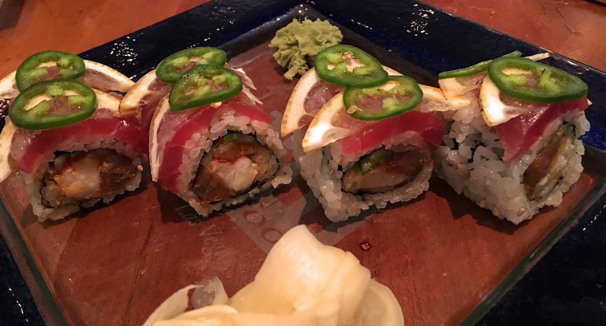 This is the Summer Roll. It is Tempura King Crab, Big Eye Tuna, Spicy Tuna and Jalapenos with Lemon.