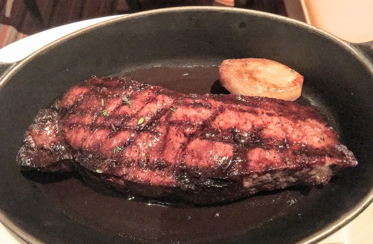 Finally my steak. I ordered a Rib Eye, but they came with a Strip. I won’t complain, same price, I like both. I preferred a little more fat, which is why I ordered the Rib Eye, but this is just as good. They serve it to you in a pan.
