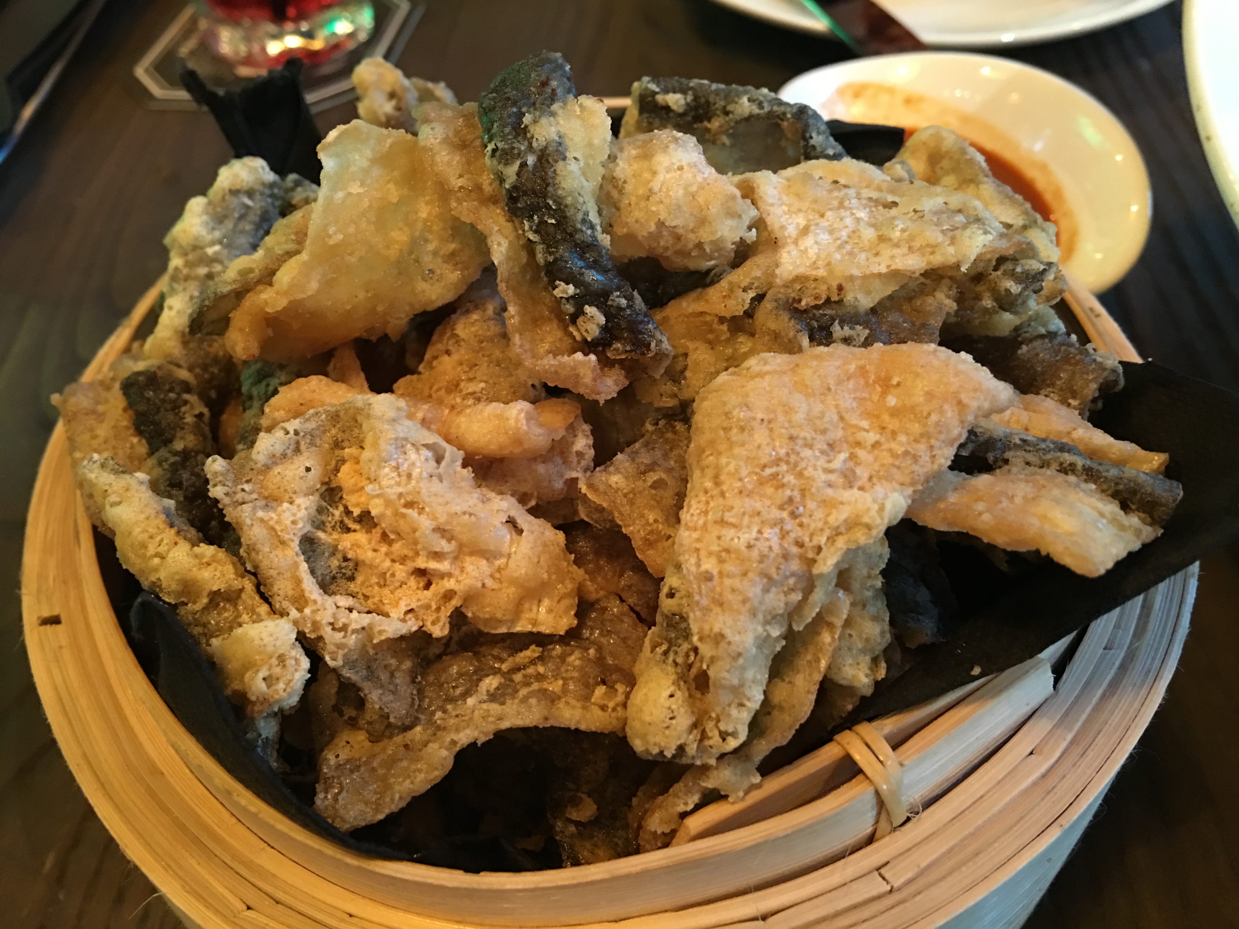 Fried Salmon Skin. A little issues, as some bunched up and when they did, the skin did not fry properly, this making it soft and truly chewy. And in some cases, some were just soaked up with too much oil. Looks nice, but I think it’s a miss.