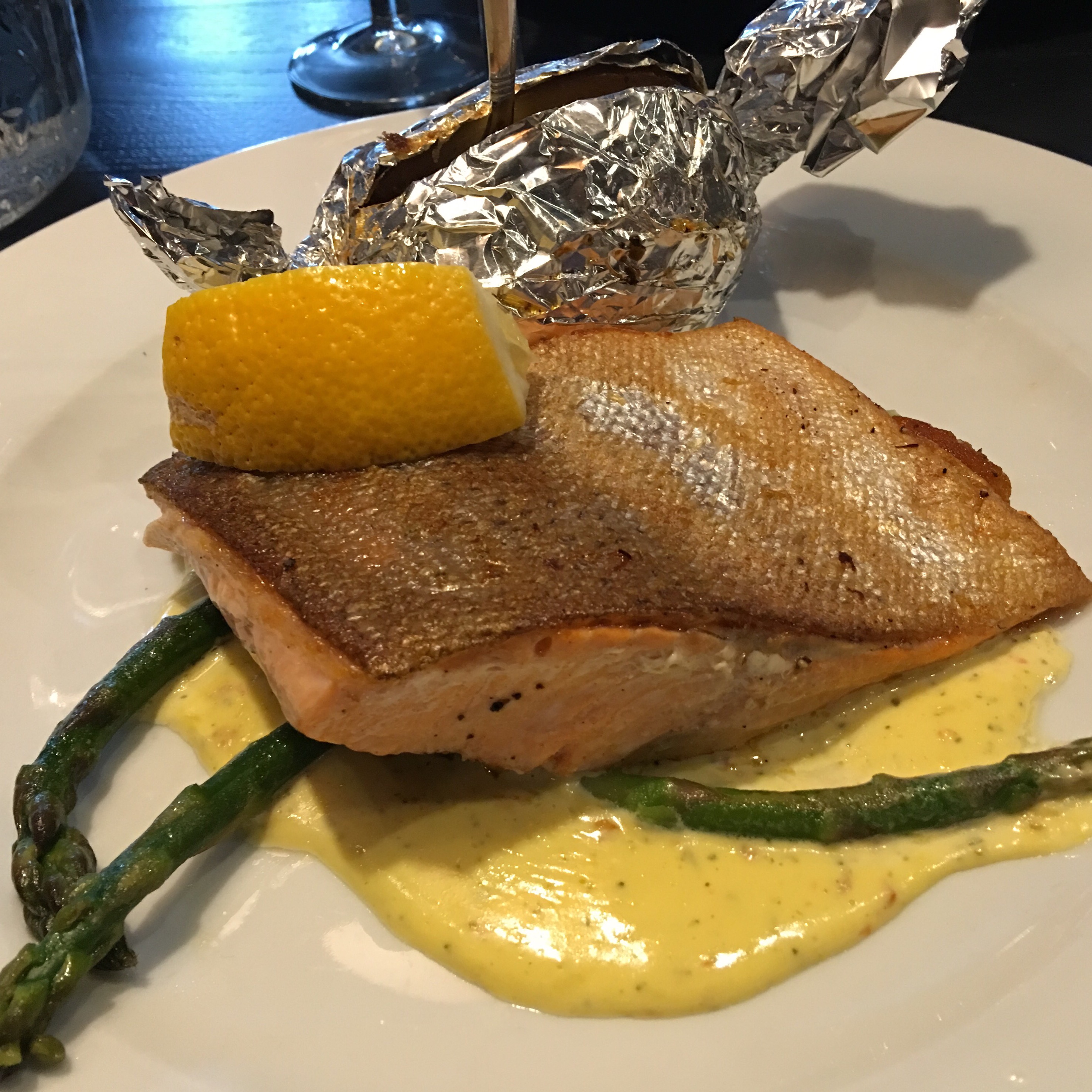 The Salmon was cooked to perfection! Just done, tender and moist. The skin crispy and well seasoned. The sauce made it a nice change of pace as well.