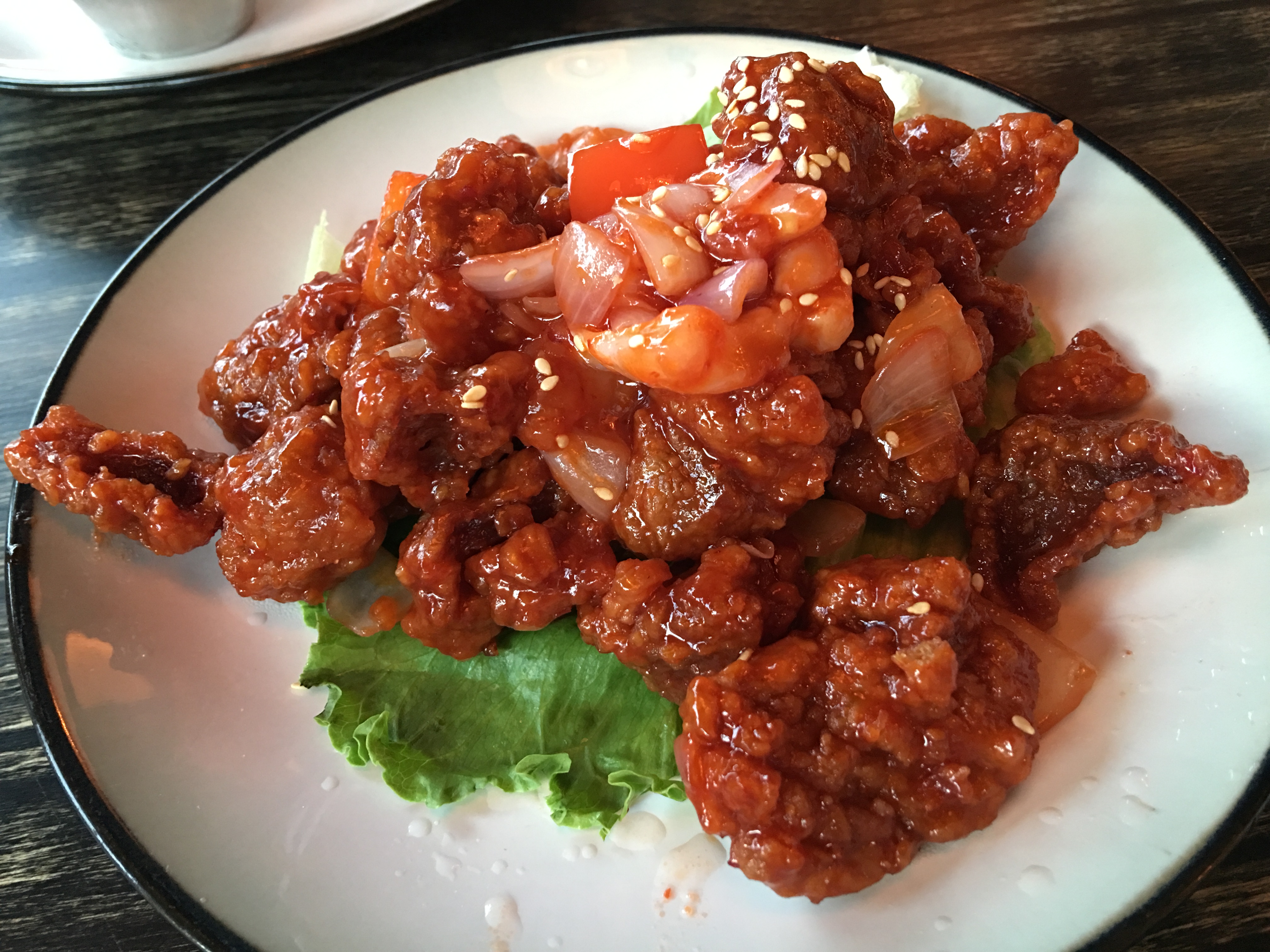 Lychee Sweet and Sour Pork. You know me, I love Sweet and Sour Pork. This one had great flavor, but it has a little bit of an issue like in many places – the pieces of meat are too small, thus when you fry them and get them crispy, the meat is overdone and as a result, a little tough. That’s what we have here.