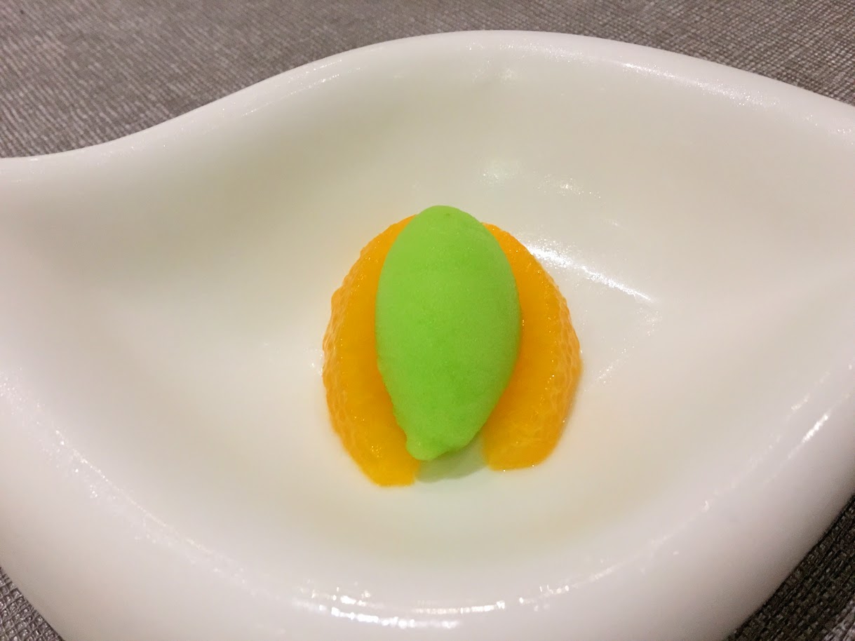A palate cleanser of Green Apple Sorbet with Orange Slices. Cool and refreshing, for sure!