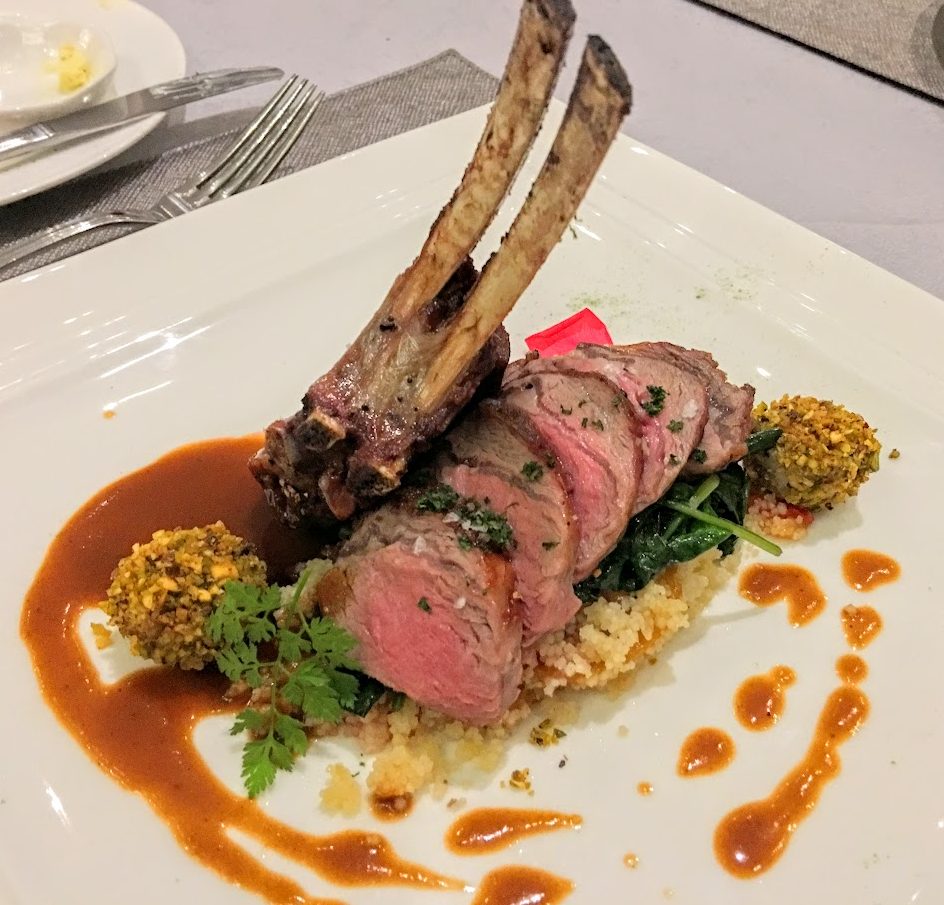 Lamb Rack on a bed of Spinach and Cous Cous with a Pistachio Foie Gras Roulade and Rosemary Lamb Jus. The lamb cooked perfectly, the jus gave it a nice pleasant zing. Just a well rounded dish.