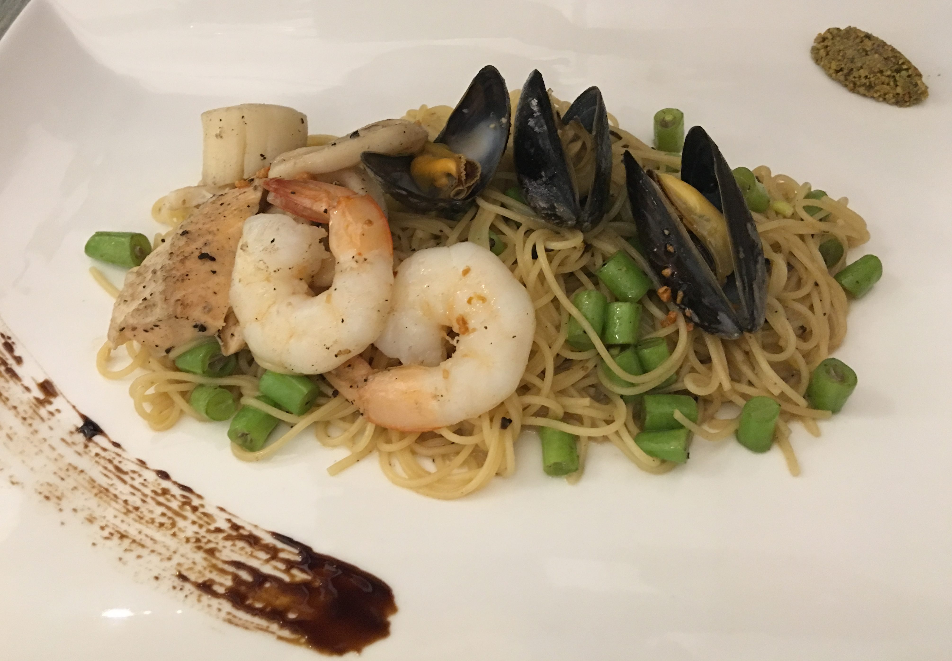 The Seafood Cappelini was a little lacking in salt, but it had a nice flavor to it. The bit of Pistachio in the top right of the picture didn’t do anything for us.