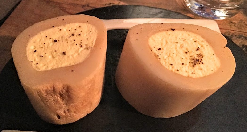 Our first course came and it was Beef Tartare, topped with a Tomato Sour Cream, all put inside of an actual Beef Bone. The Tartare was on the bottom, layered with the Sour Cream. A little rich, but the taste was quite nice.