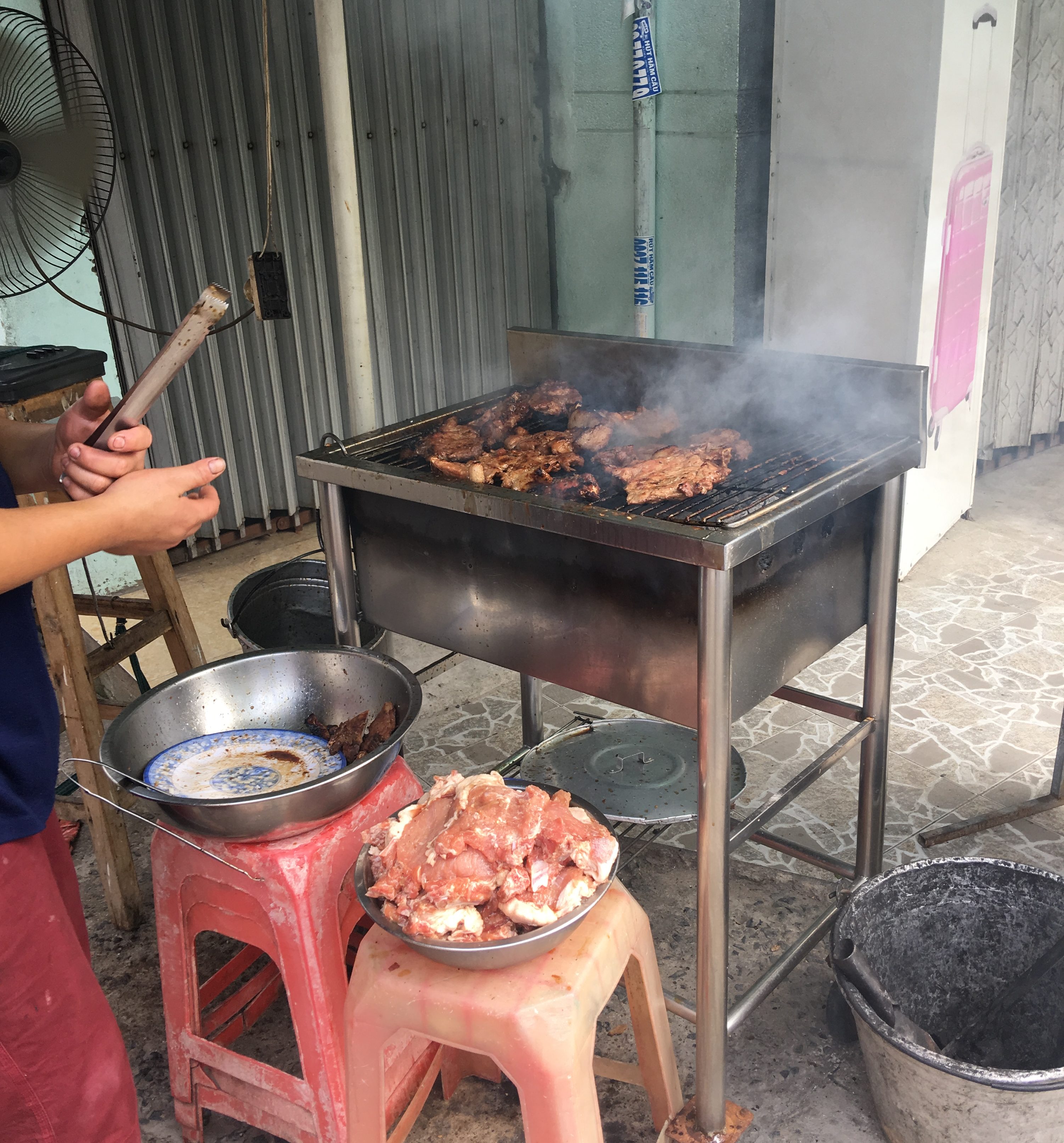 You smell grilled meat all the time in Ho Chi Minh. So for lunch, my colleague brought me past the guy grilling on the street, down an alley to a place to eat that was the first story of someone’s house.