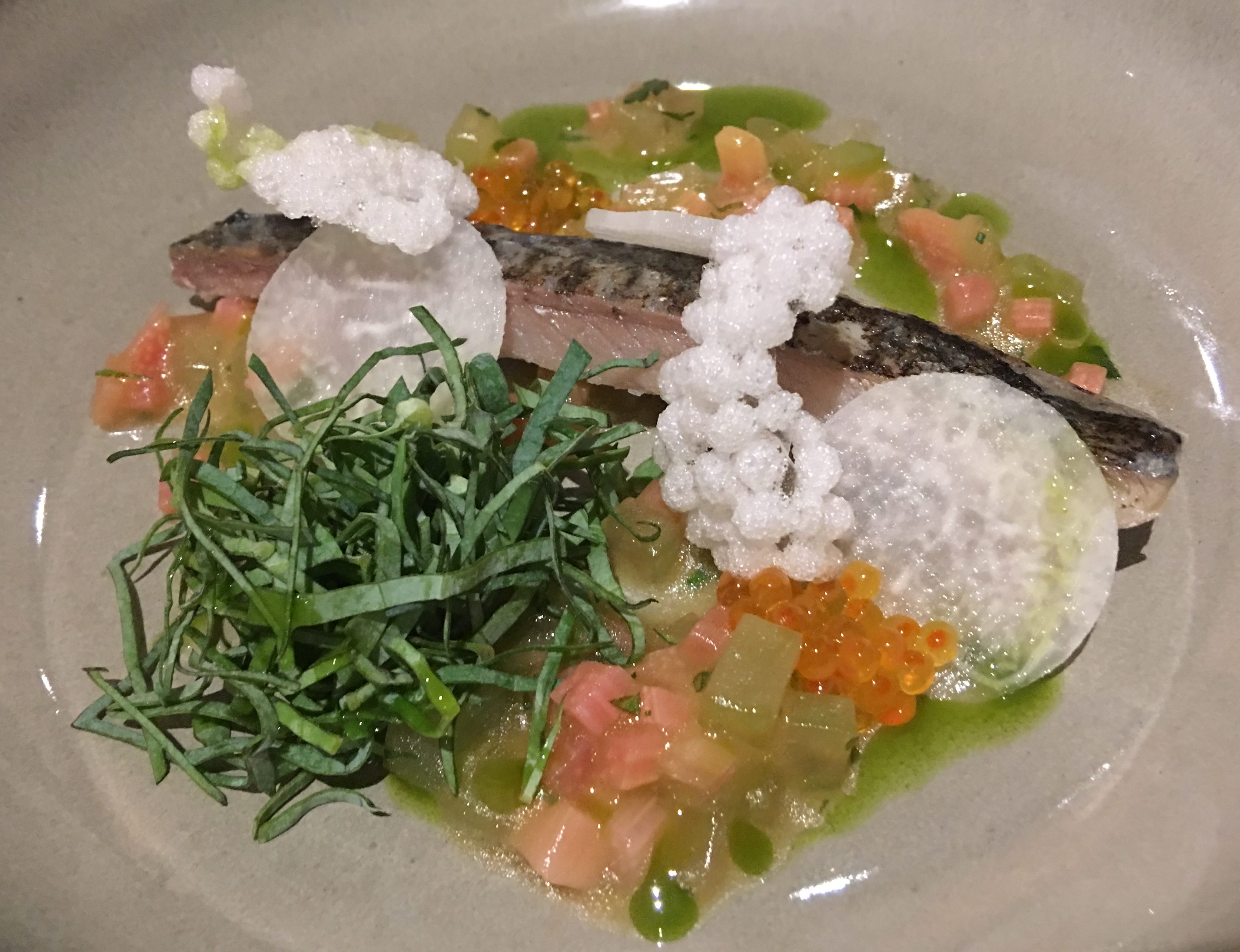Our first dish was Smoked Mackerel with pickled Rhubarb and another pickled item. Along with Roe, Oyster Leaves (that taste like Oysters!), Kohlrabi slices and puffed Sago.