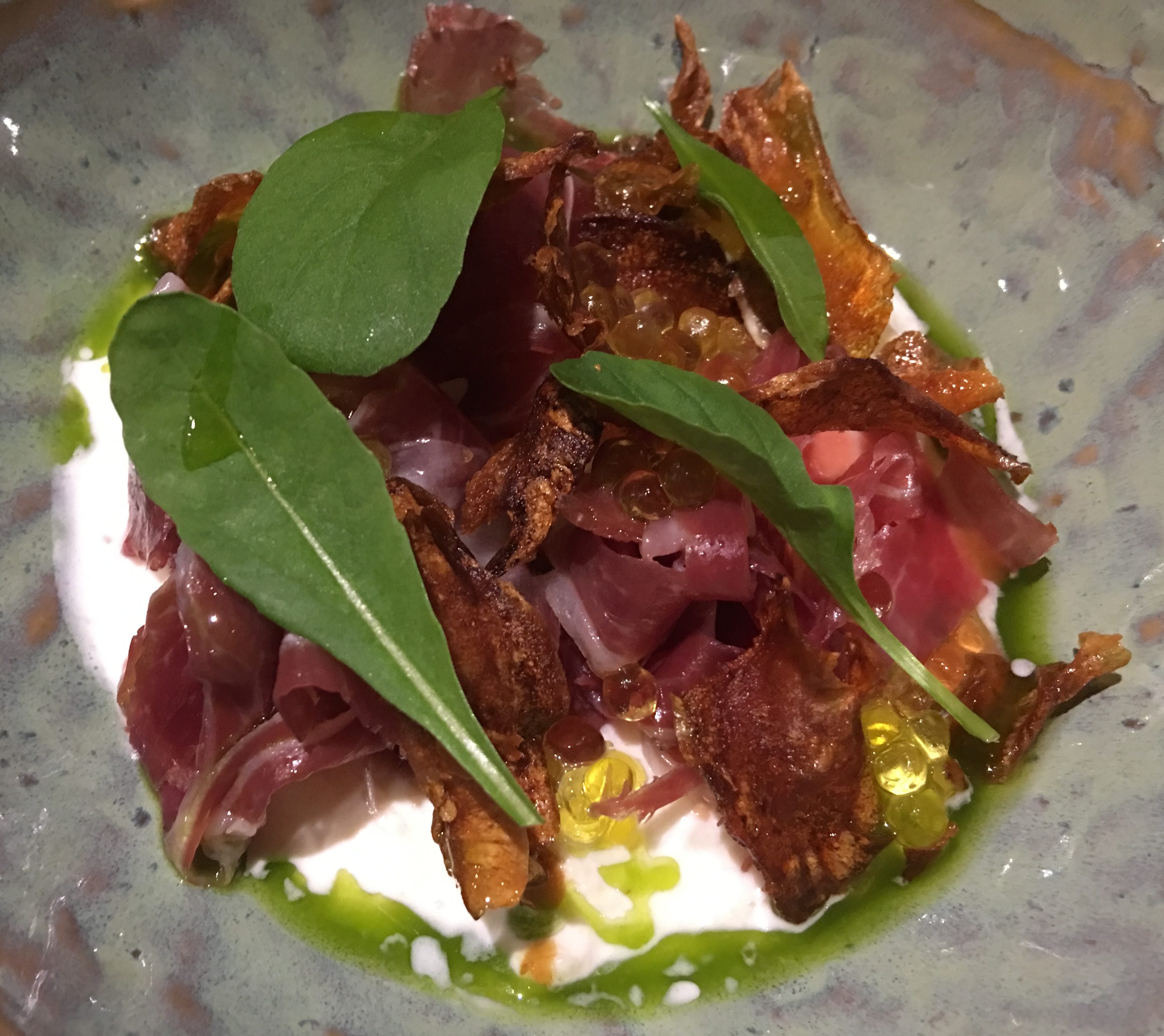 Burrata, chopped up, garnished with Caviar (yellow!), Iberico Ham and Pork. So creamy and the cheese cuts the saltiness of the Ham.