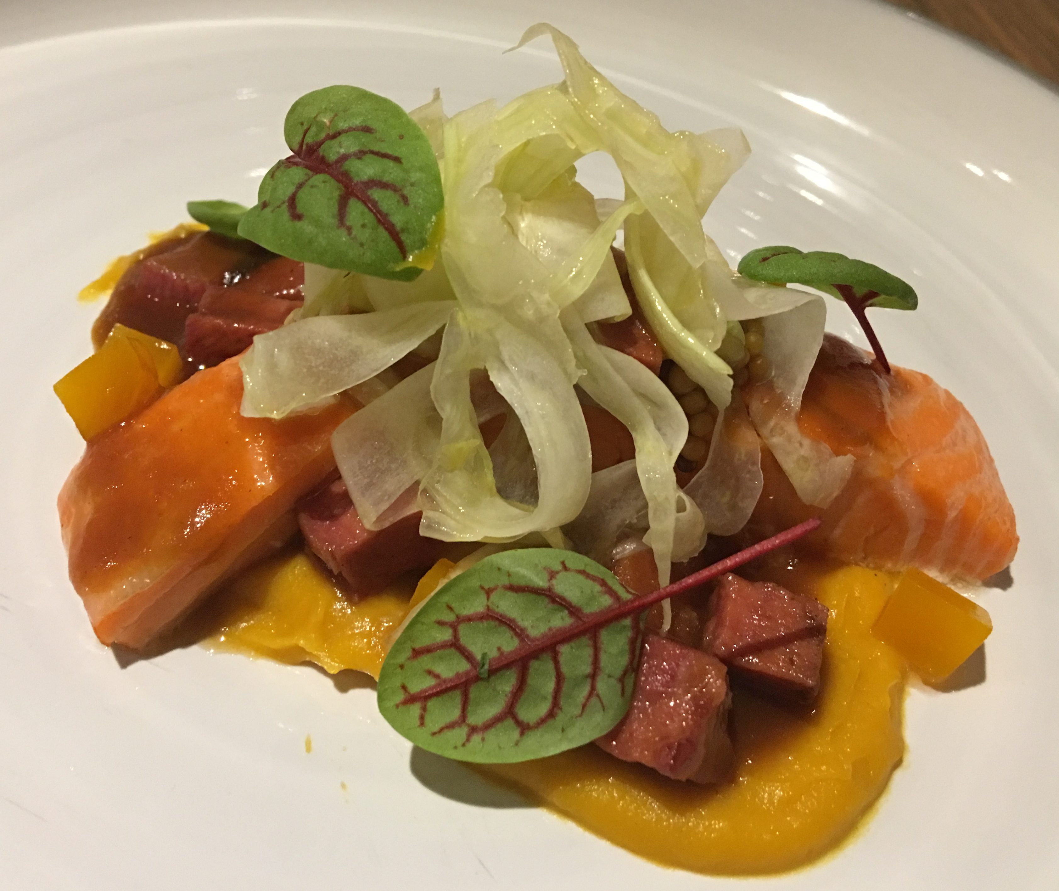 The next dish was all mine. Trout on Pumpkin with Tete de Veau (Veal Tongue), Fennel, Pickled Pumpkin.